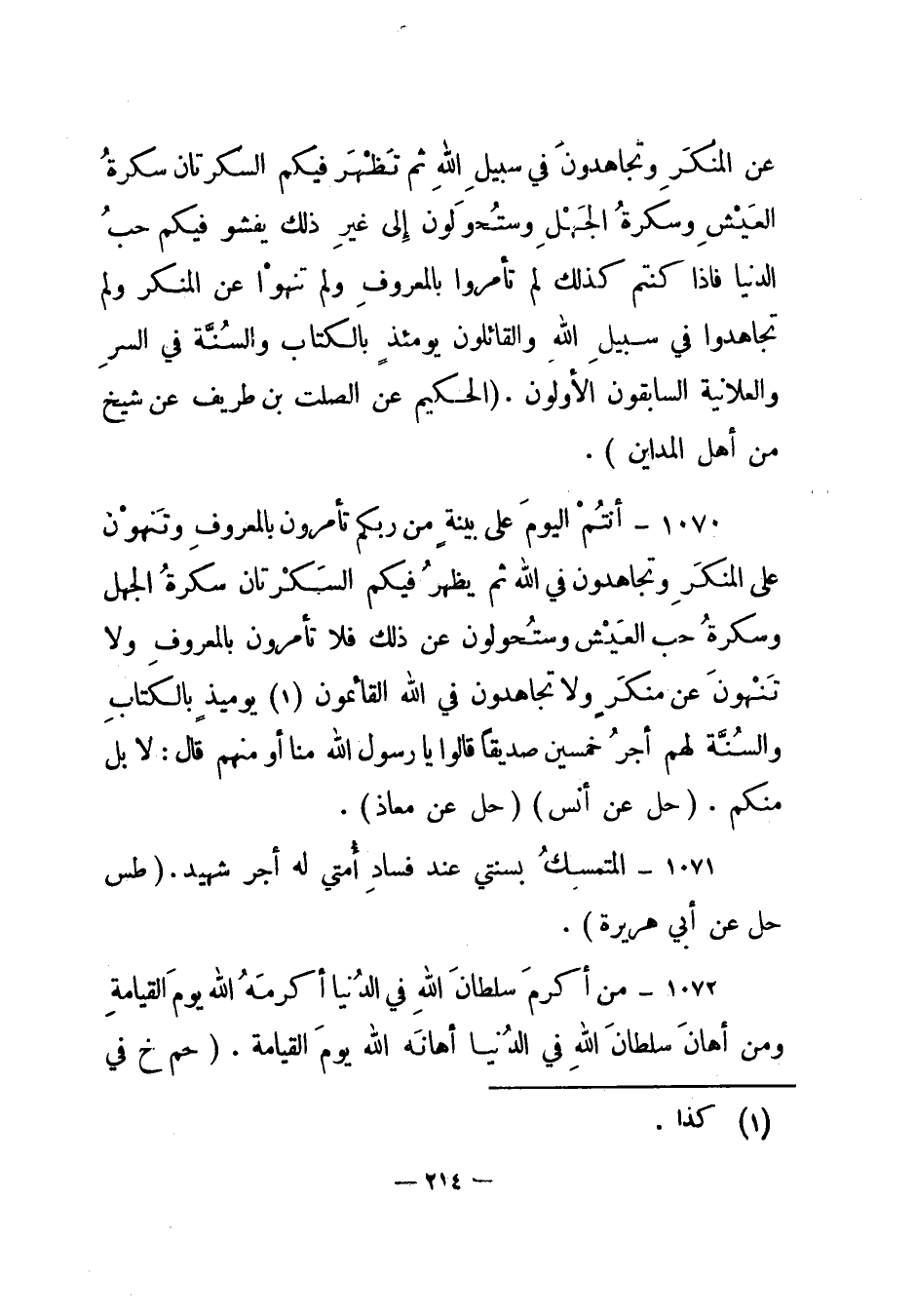 1070 – "أنتم اليوم على بينة من ربكم تأمرون بالمعروف وتنهون عن المنكر وتجاهدون في الله ثم يظهر فيكم السكرتان سكرة الجهل وسكرة حب العيش وستحولون عن ذلك فلا تأمرون بالمعروف ولا تنهون عن منكر ولا تجاهدون في الله القائمون (1) يومئذ بالكتاب والسنة لهم أجر خمسين صديقا قالوا يا رسول الله منا أو منهم قال: لا بل منكم". (حل عن أنس) (حل عن معاذ) .