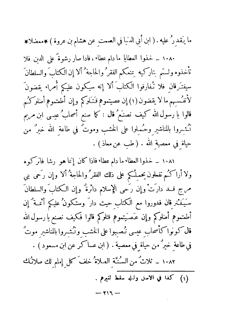 1081 – "خذوا العطاء ما دام عطاء فإذا كان إنما هو رشا فاتركوه ولا أراكم تفعلون يحملكم على ذلك الفقر والحاجة ألا وإن رحى بني مرج قد دارت وإن رحا الإسلام دائرة وإن الكتاب والسلطان سيفترقان فدوروا مع الكتاب حيث دار وستكون عليكم أئمة إن أطعتموهم أضلوكم وإن عصيتموهم قتلوكم قالوا فكيف نصنع يا رسول الله قال كونوا كأصحاب عيسى نصبوا على الخشب ونشروا بالمناشير موت في طاعة خير من حياة في معصية". (ابن عساكر عن ابن مسعود) .