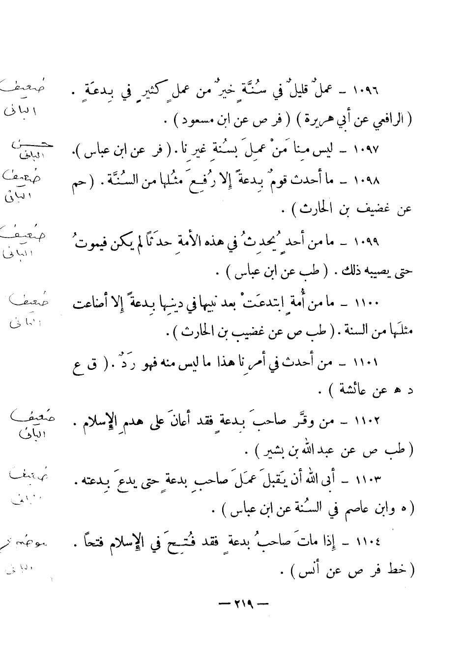 1100 – "ما من أمة ابتدعت بعد نبيها في دينها بدعة إلا أضاعت مثلها من السنة". (طب ص عن غضيب بن الحارث) .