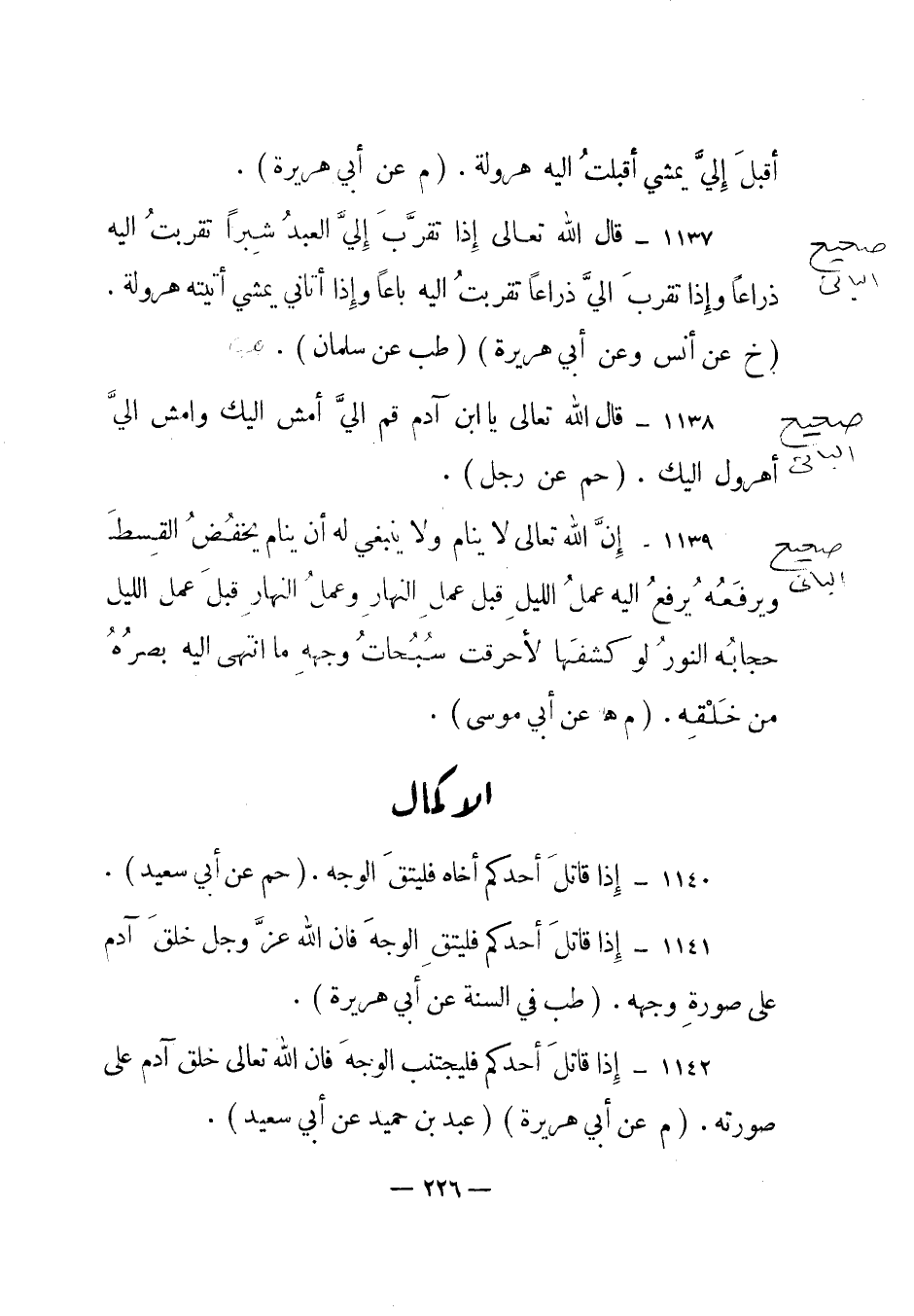 1137 – "قال الله تعالى: إذا تقرب إلي العبد شبرا تقربت إليه ذراعا وإذا تقرب إلي ذراعا تقربت إليه باعا وإذا أتاني يمشي أتيته هرولة". (خ عن أنس وعن أبي هريرة) (طب عن سلمان) .