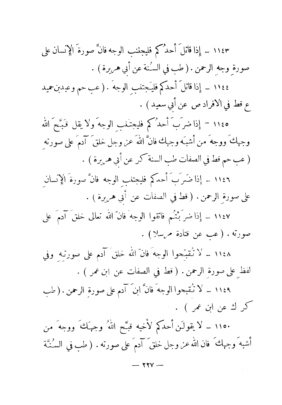 1143 – "إذا قاتل أحدكم فليجتنب الوجه فإن صورة الإنسان على صورة وجه الرحمن". (طب في السنة عن أبي هريرة) .