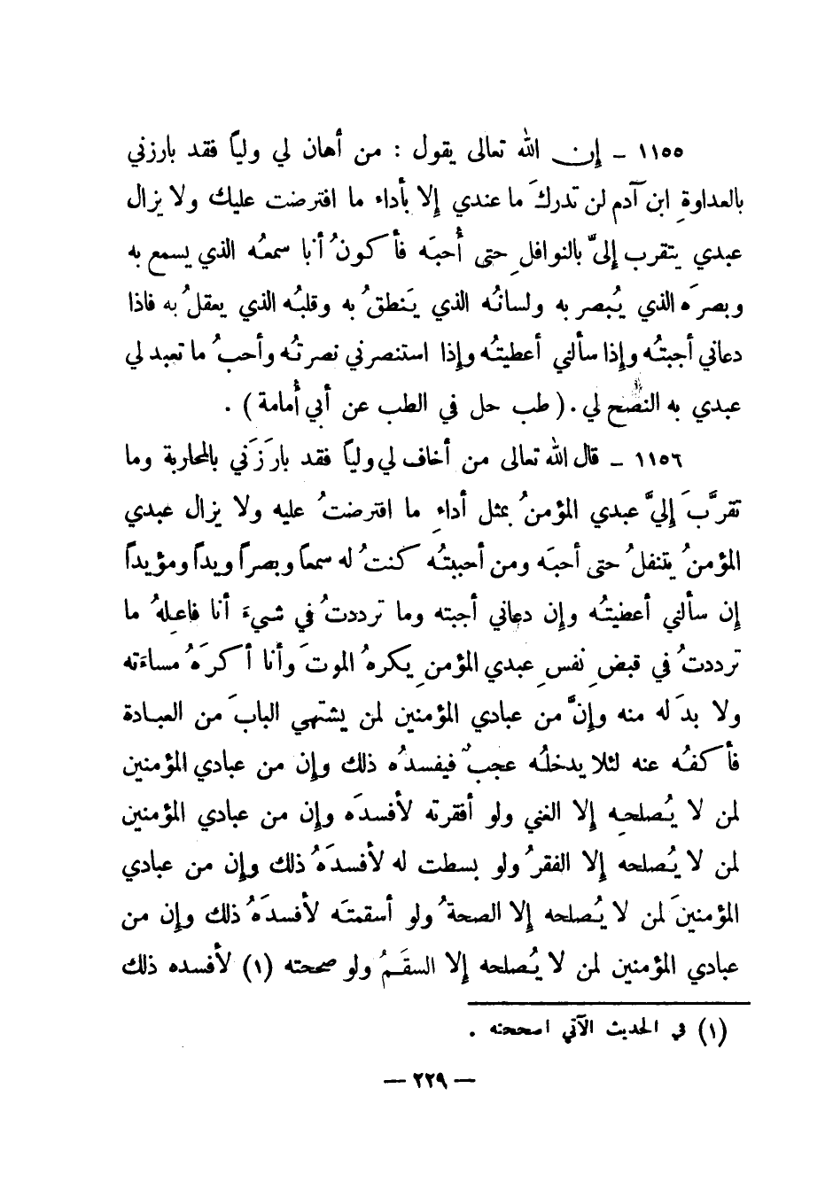 1156 - "قال الله تعالى: من أخاف لي وليا فقد بارزني بالمحاربة وما تقرب إلي عبدي المؤمن بمثل أداء ما افترضت عليه ولا يزال عبدي المؤمن يتنفل حتى أحبه ومن أحببته كنت له سمعا وبصرا ويدا ومؤيدا إن سألني أعطيته وإن دعاني أجبته وما ترددت في شيء أنا فاعله ما ترددت في قبض نفس عبدي المؤمن يكره الموت وأنا أكره مساءته ولا بد له منه وإن من عبادي المؤمنين لمن يشتهي الباب من العبادة فأكفه عنه لئلا يدخله عجب فيفسده ذلك وإن من عبادي المؤمنين لمن لا يصلحه إلا الغني ولو أفقرته لأفسده وإن من عبادي المؤمنين لمن لا يصلحه إلا الفقر ولوبسطت له لأفسده ذلك وإن من عبادي المؤمنين لمن لا يصلحه إلا الصحة ولو أسقمته لأفسده ذلك وإن من عبادي المؤمنين لمن لا يصلحه إلا السقم ولو صححته (1) لأفسده ذلك