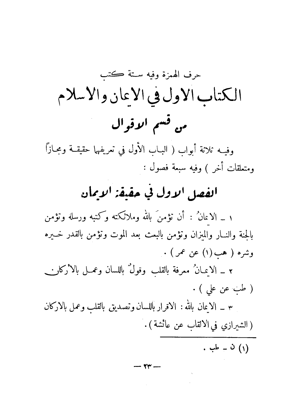 الكتاب الأول في الإيمان والإسلام من قسم الأقوال