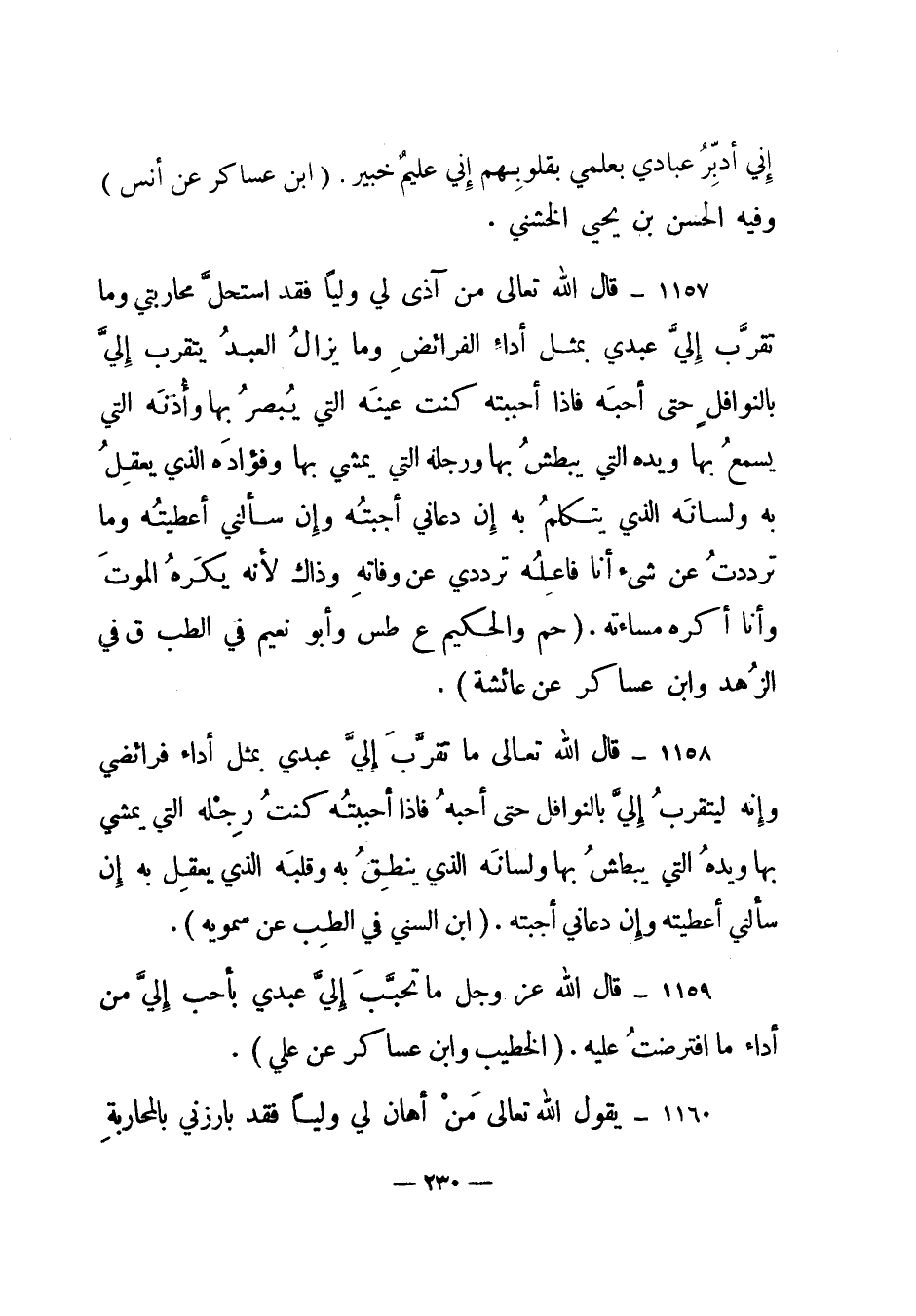 1158 - "قال الله تعالى: ما تقرب إلي عبدي بمثل أداء فرائضي وإنه ليتقرب إلي بالنوافل حتى أحبه فإذا أحببته كنت رجله التي يمشي بها ويده التي يبطش بها ولسانه الذي ينطق به وقلبه الذي يعقل به إن سألني أعطيته وإن دعاني أجبته". (ابن السني في الطب عن سمويه) .
