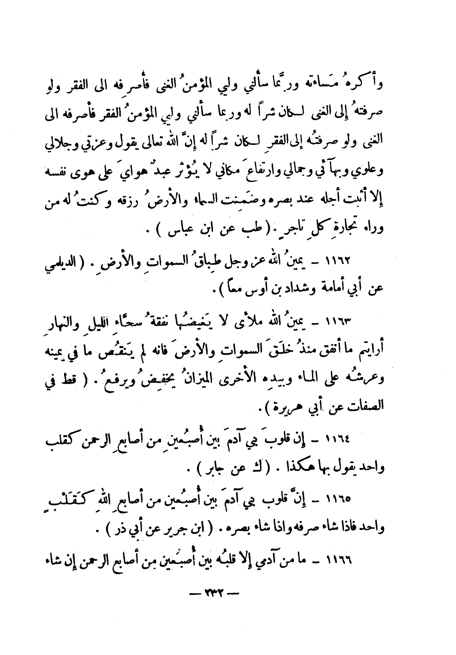 1165 – "إن قلوب بني آدم بين أصبعين من أصابع الله كقلب واحد فإذا شاء صرفه وإذا شاء بصره". (ابن جرير عن أبي ذر) .