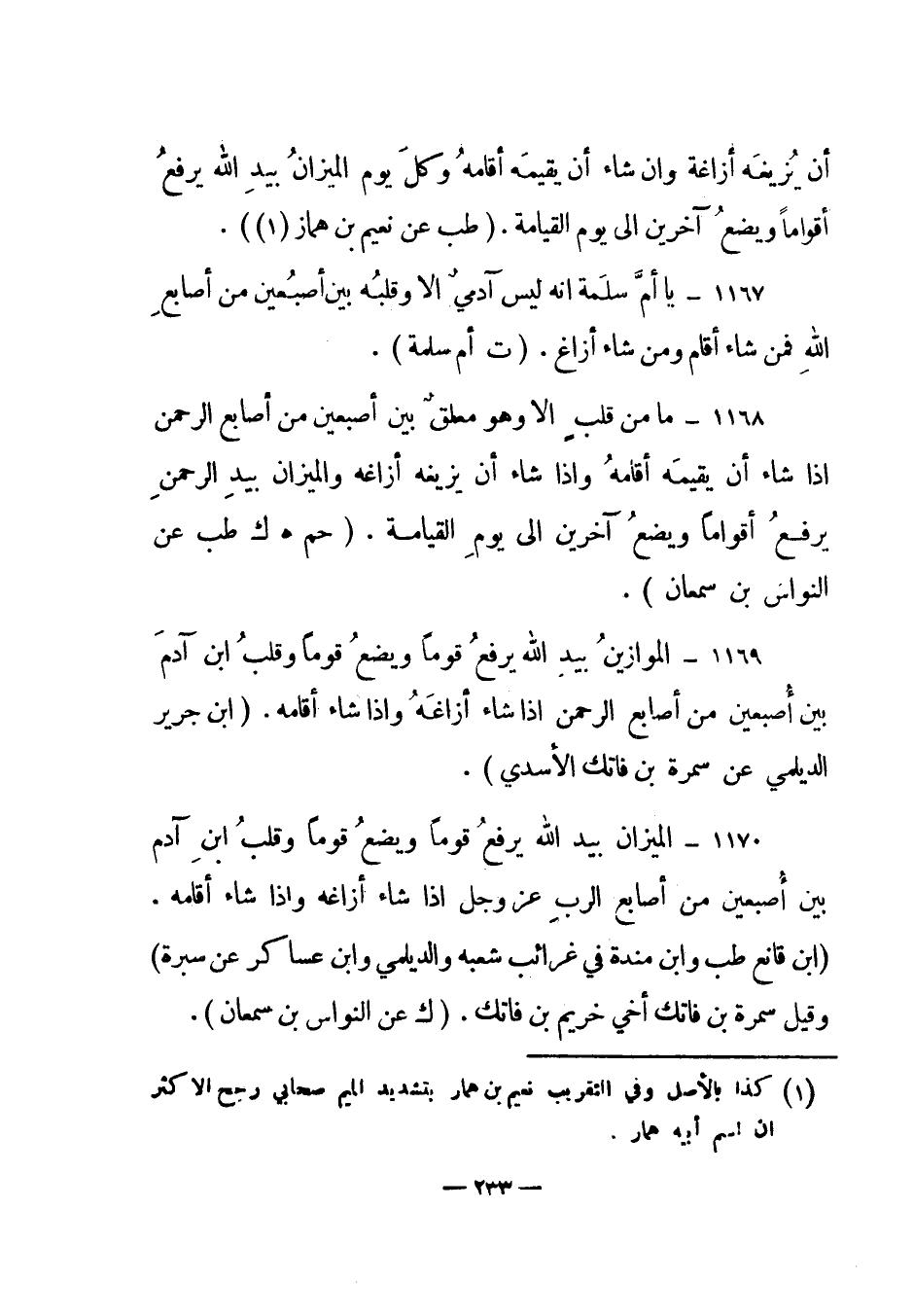 1168 – "ما من قلب إلا وهو معلق بين أصبعين من أصابع الرحمن إذا شاء أن يقيمه أقامه وإذا شاء أن يزيغه أزاغه والميزان بيد الرحمن يرفع أقواما ويضع آخرين إلى يوم القيامة". (حم هـ ك طب عن النواس بن سمعان) .
