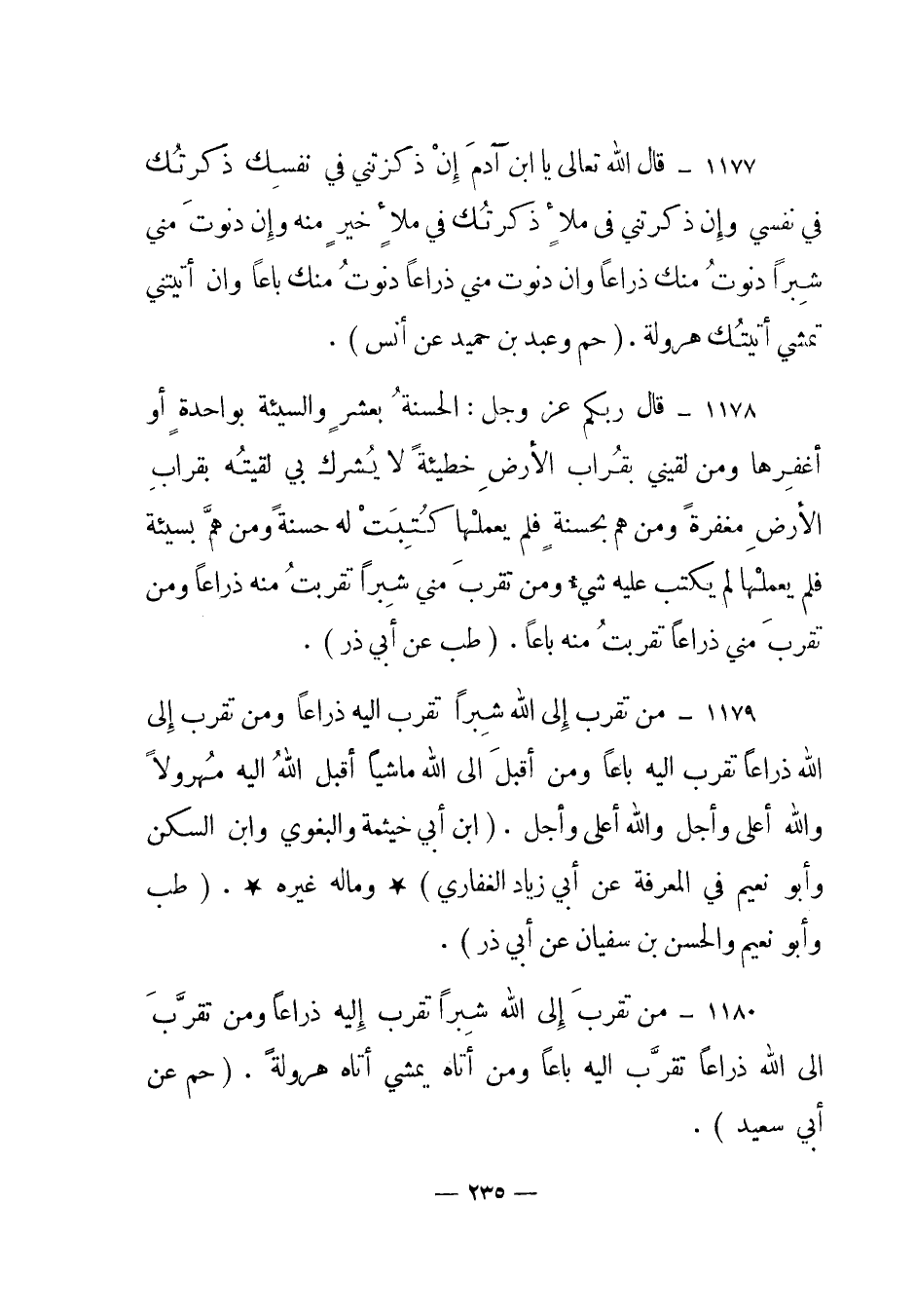 1180 – "من تقرب إلى الله شبرا تقرب إليه ذراعا ومن تقرب إلى الله ذراعا تقرب إليه باعا ومن أتاه يمشي أتاه هرولة". (حم عن أبي سعيد) .
