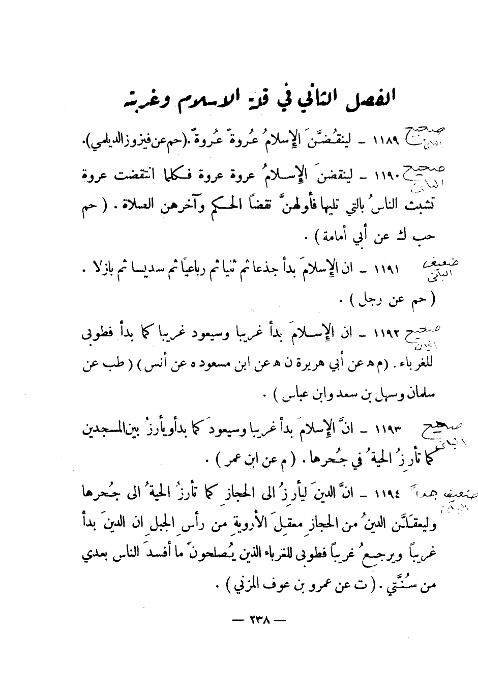 1193 – "إن الإسلام بدأ غريبا وسيعود كما بدأ ويأرز بين المسجدين كما تأرز الحية في جحرها".
