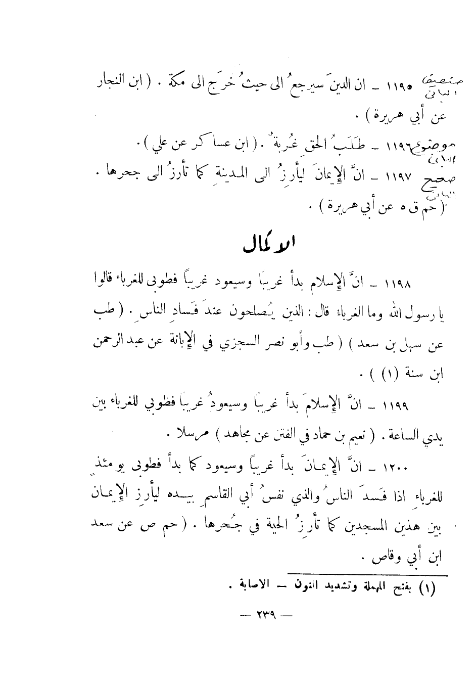 1198 – "إن الإسلام بدأ غريبا وسيعود غريبا فطوبى للغرباء قالوا يا رسول الله وما الغرباء قال: الذين يصلحون عند فساد الناس". (طب عن سهل بن سعد) (طب وأبو نصر السجزي في الإبانة عن عبد الرحمن ابن سنة (1)