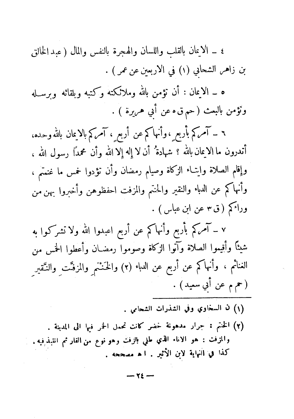 6 – "آمركم بأربع، وأنهاكم عن أربع، آمركم بالإيمان بالله وحده أتدرون ما الإيمان بالله؟ شهادة أن لا إله إلا الله وأن محمدا رسول الله، وإقام الصلاة وإيتاء الزكاة وصيام رمضان وأن تؤدوا خمس ماغنمتم، وأنهاكم عن الدباء والنقير والحنتم والمزفت احفظوهن وأخبروا بهن من وراءكم" (ق 3 عن ابن عباس)