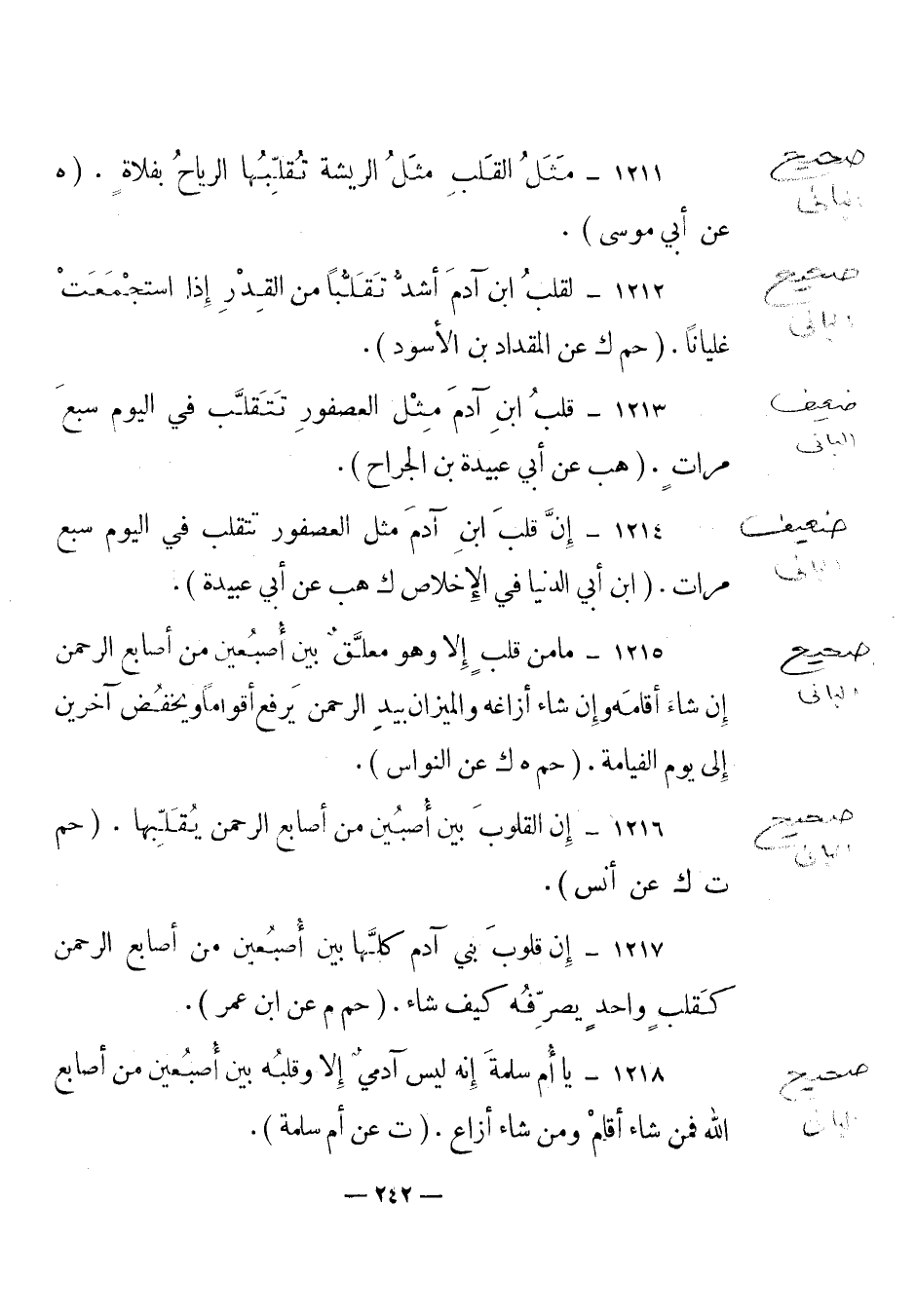 1216 – "إن القلوب بين أصبعين من أصابع الرحمن يقلبها". (حم ت ك عن أنس) .