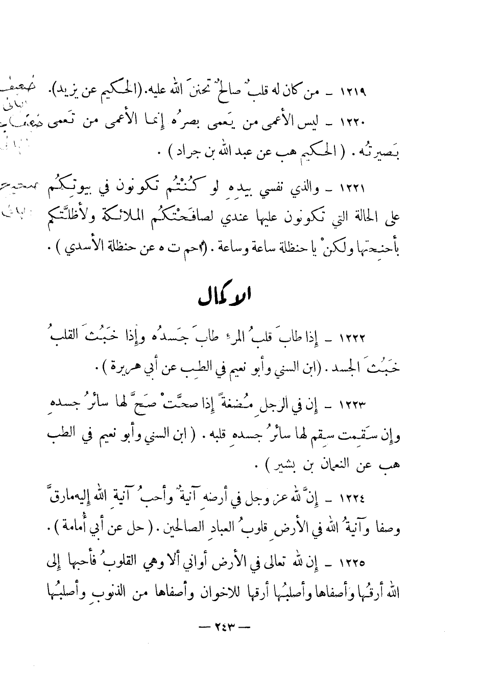 1223 – "إن في الرجل مضغة إذا صحت صح لها سائر جسده وإن سقمت سقم لها سائر جسده قلبه". (ابن السني وأبو نعيم في الطب هب عن النعمان بن بشير) .