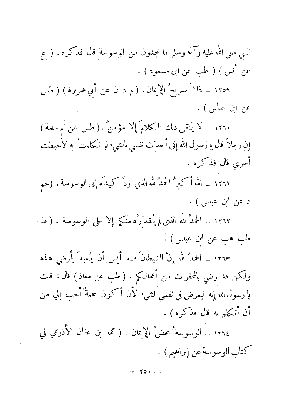 1264 – "الوسوسة محض الإيمان". (محمد بن عفان الأذرعي في كتاب الوسوسة عن إبراهيم) .