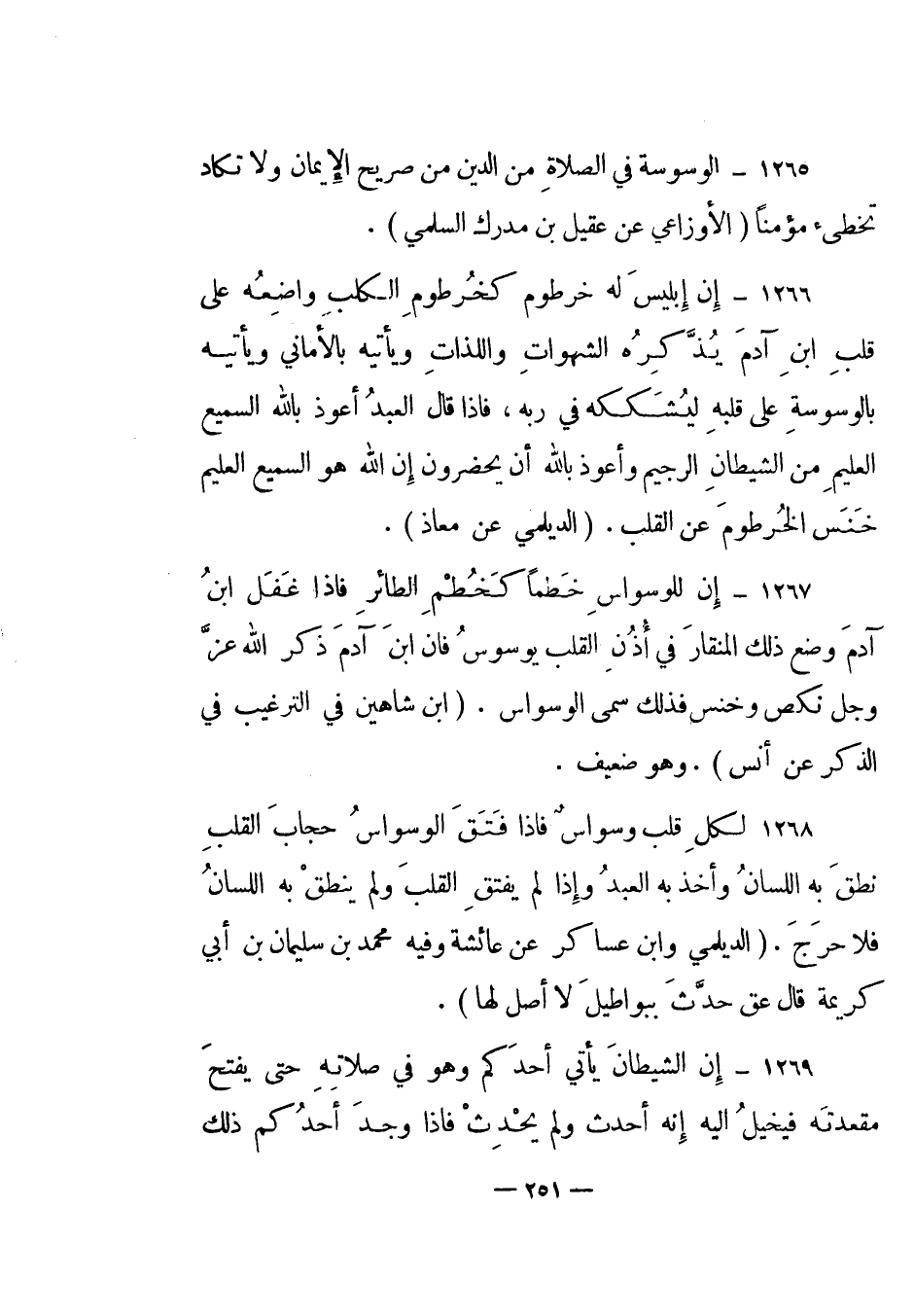 1265 – "الوسوسة في الصلاة من الدين من صريح الإيمان ولا تكاد تخطئ مؤمنا". (الأوزاعي عن عقيل بن مدرك السلمي) .