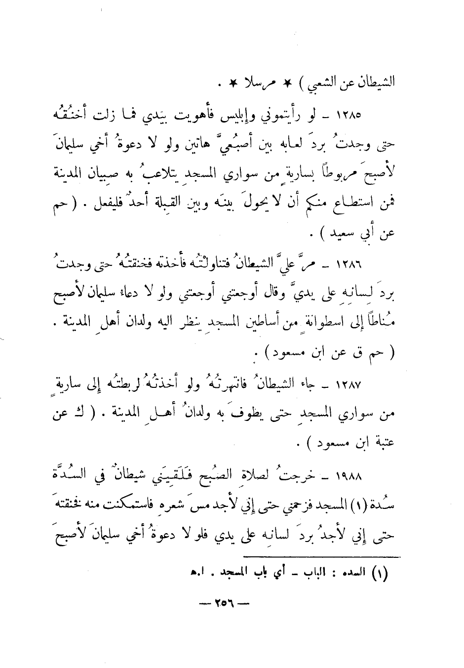 1287 – "جاء الشيطان فانتهرته ولو أخذته لربطته إلى سارية من سوراي المسجد حتى يطوف به ولدان أهل المدينة". (ك عن عتبة ابن مسعود) .