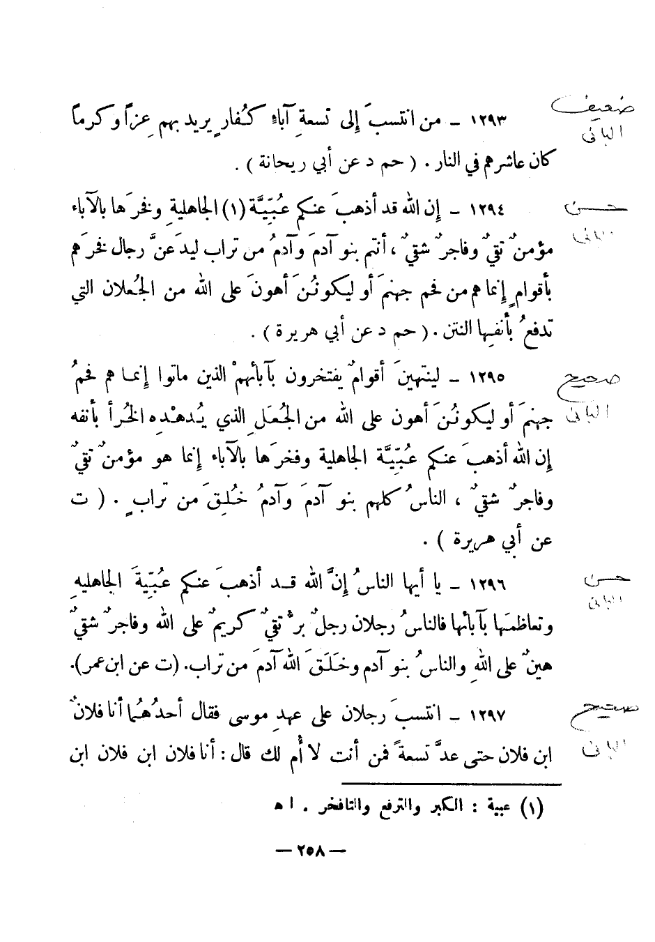 1295 – "لينتهين أقوام يفتخرون بآبائهم الذين ماتوا إنما هم فحم جهنم أو ليكونن أهون على الله من الجعل الذي يدهده الخرأ بأنفه إن الله أذهب عنكم عبية الجاهلية وفخرها بالآباء إنما هو مؤمن تقي وفاجر شقي، الناس كلهم بنو آدم وآدم خلق من تراب". (ت عن أبي هريرة) .