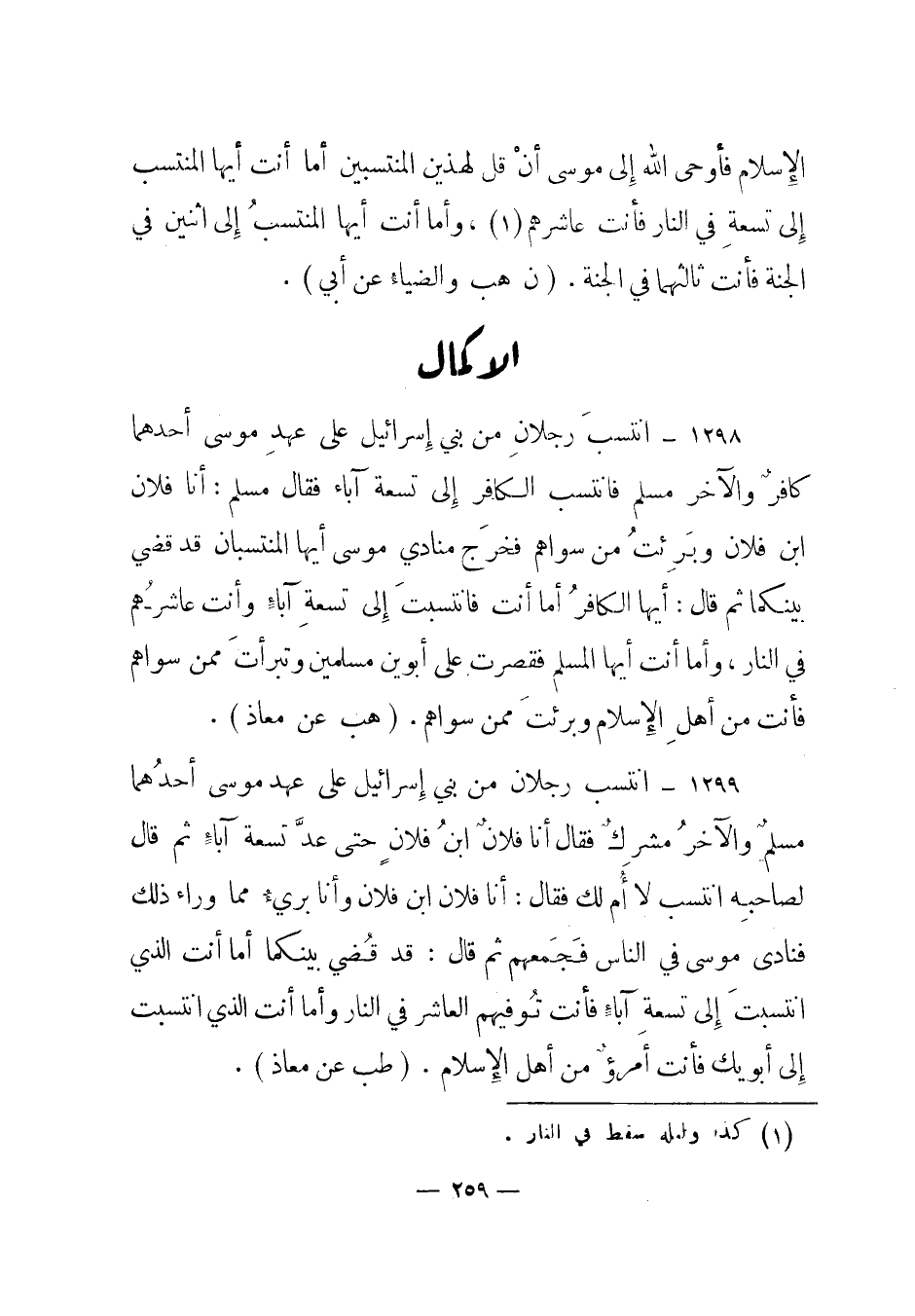1299 – "انتسب رجلان من بني إسرائيل على عهد موسى أحدهما مسلم والآخر مشرك فقال أنا فلان ابن فلان حتى عد تسعة آباء ثم قال لصاحبه انتسب لا أم لك فقال: أنا فلان ابن فلان وأنا بريء مما وراء ذلك فنادى موسى في الناس فجمعهم ثم قال: قد قضي بينكما أما أنت الذي انتسبت إلى تسعة آباء فأنت توفيهم العاشر في النار وأما أنت الذي انتسبت إلى أبويك فأنت امرؤ من أهل الإسلام". (طب عن معاذ) .