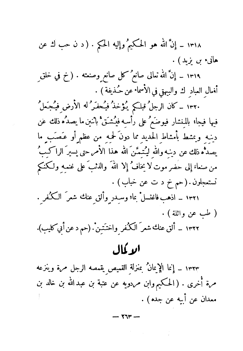 1320 – "كان الرجل قبلكم يؤخذ فيحفر له الأرض فيجعل فيها فيجاء بالمنشار فيوضع على رأسه فيشق باثنين ما يصده ذلك عن دينه ويمشط بأمشاط الحديد مما دون لحمه من عظم أو عصب ما يصده ذلك عن دينه والله ليتمن هذا الأمر حتى يسير الراكب من صنعاء إلى حضرموت لا يخاف إلا الله والذئب على غنمه ولكنكم تستعجلون". (حم خ د ت عن خباب) .