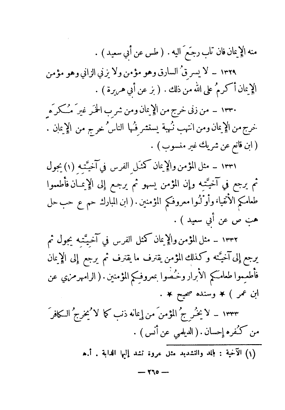 1330 – "من زنى خرج من الإيمان ومن شرب الخمر غير مكره خرج من الإيمان ومن انتهب نهبة يستشرفها الناس خرج من الإيمان". (ابن قانع عن شريك غير منسوب) .