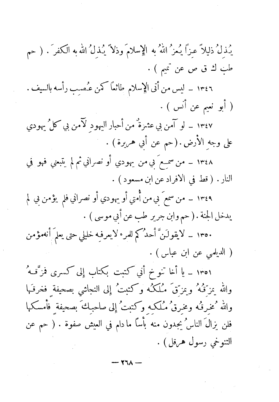 1351 – "يا أخا تنوخ أني كتبت بكتاب إلى كسرى فمزقه والله يمزقه ويمزق ملكه وكتبت إلى النجاشي بصحيفة فخرقها والله مخرقه ومخرق ملكه وكتبت إلى صاحبك بصحيفة فأمسكها فلن يزال الناس يجدون منه بأسا ما دام في العيش صفوة". (حم عن التنوخي رسول هرقل) .