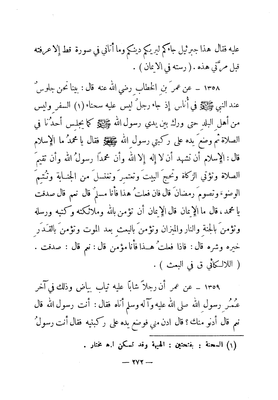 1358 - عن عمر بن الخطاب رضي الله عنه قال: "بينا نحن جلوس عند النبي صلى الله عليه وسلم في أناس إذ جاء رجل ليس عليه سحناء (1) السفر وليس من أهل البلد حتى ورك بين يدي رسول الله صلى الله عليه وسلم كما يجلس أحدنا في الصلاة ثم وضع يده على ركبتي رسول الله صلى الله عليه وسلم فقال يا محمد ما الإسلام قال: الإسلام أن تشهد أن لا إله إلا الله وأن محمدا رسول الله وأن تقيم الصلاة وتؤتي الزكاة وتحج البيت وتعتمر وتغتسل من الجنابة وتتم الوضوء وتصوم رمضان قال فإن فعلت هذا فأنا مسلم قال نعم قال صدقت يا محمد، قال ما الإيمان قال الإيمان أن تؤمن بالله وملائكته وكتبه ورسله وتؤمن بالجنة والنار والميزان وتؤمن بالبعث بعد الموت وتؤمن بالقدر خيره وشره قال: فإذا فعلت هذا فأنا مؤمن قال: نعم قال: صدقت". (اللا لكائي ق في البعث) .