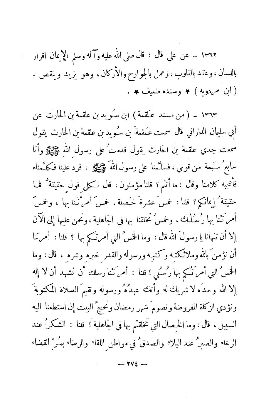 1363 - (من مسند علقمة) ابن سويد بن علقمة بن الحارث عن أبي سليمان الداراني قال سمعت علقمة بن سويد بن علقمة بن الحارث يقول سمعت جدي علقمة بن الحارث يقول "قدمت على رسول الله صلى الله عليه وسلم وأنا سابع سبعة من قومي، فسلمنا على رسول الله صلى الله عليه وسلم، فرد علينا فكلمناه فأعجبه كلامنا وقال: ما أنتم؟ قلنا مؤمنون، قال لكل قول حقيقة فما حقيقة إيمانكم؟ قلنا: خمس عشرة خصلة، خمس أمرتنا بها، وخمس أمرتنا بها رسلك، وخمس تخلقنا بها في الجاهلية، ونحن عليها إلى الآن إلا أن تنهانا يا رسول الله قال: وما الخمس التي أمرتكم بها؟ قلنا: أمرتنا أن نؤمن بالله وملائكته وكتبه ورسوله والقدر خيره وشره، قال: وما الخمس التي أمرتكم بها رسلي؟ قلنا: أمرتنا رسلك أن نشهد أن لا إله إلا الله وحده لا شريك له وأنك عبده ورسوله ونقيم الصلاة المكتوبة ونؤدي الزكاة المفروضة ونصوم شهر رمضان ونحج البيت إن استطعنا إليه السبيل، قال: وما الخصال التي تخلقتم بها في الجاهلية؟ قلنا: الشكر عند الرخاء والصبر عند البلاء والصدق في مواطن اللقاء والرضاء بمر القضاء