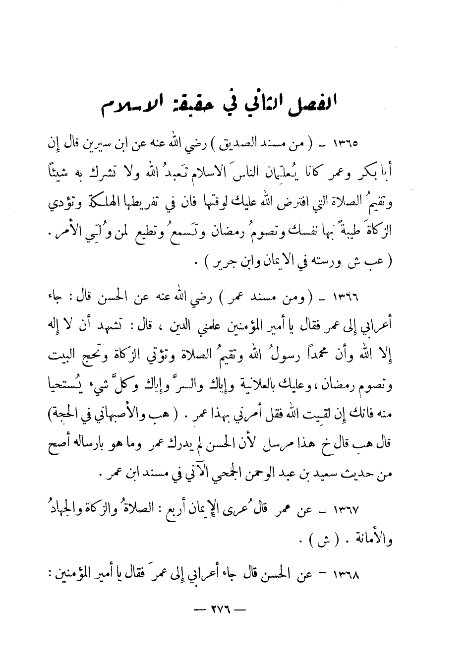 1366 - (ومن مسند عمر) رضي الله عنه عن الحسن قال: "جاء أعرابي إلى عمر فقال يا أمير المؤمنين علمني الدين، قال: تشهد أن لا إله إلا الله وأن محمدا رسول الله وتقيم الصلاة وتؤتي الزكاة وتحج البيت وتصوم رمضان وعليك بالعلانية وإياك والسر وإياك وكل شيء يستحيا منه فإنك إن لقيت الله فقل أمرني بهذا عمر". (هب والأصبهاني في الحجة) قال هب قال خ هذا مرسل لأن الحسن لم يدرك عمر وما هو بإرساله أصح من حديث سعيد بن عبد الرحمن الجمحي الآتي في مسند ابن عمر.