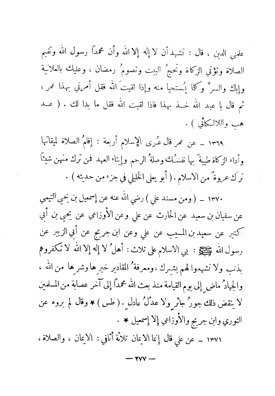 1369 - عن عمر قال "عرى الإسلام أربعة: إقام الصلاة لميقاتها وأداء الزكاة طيبة بها نفسك وصلة الرحم وإيتاء العهد فمن ترك منهن شيئا ترك عروة من الإسلام". (أبويعلى الخليلي في جزء من حديثه) .