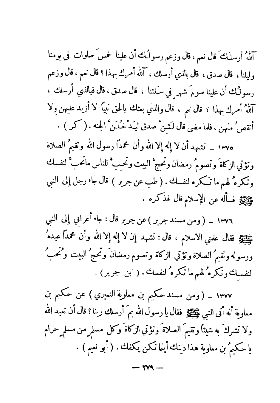 1375 – "تشهد أن لا إله إلا الله وأن محمدا رسول الله وتقيم الصلاة وتؤتي الزكاة وتصوم رمضان وتحج البيت وتحب للناس ما تحب لنفسك وتكره لهم ما تكره لنفسك". (طب عن جرير) قال جاء رجل إلى النبي صلى الله عليه وسلم فسأله عن الإسلام قال فذكره.