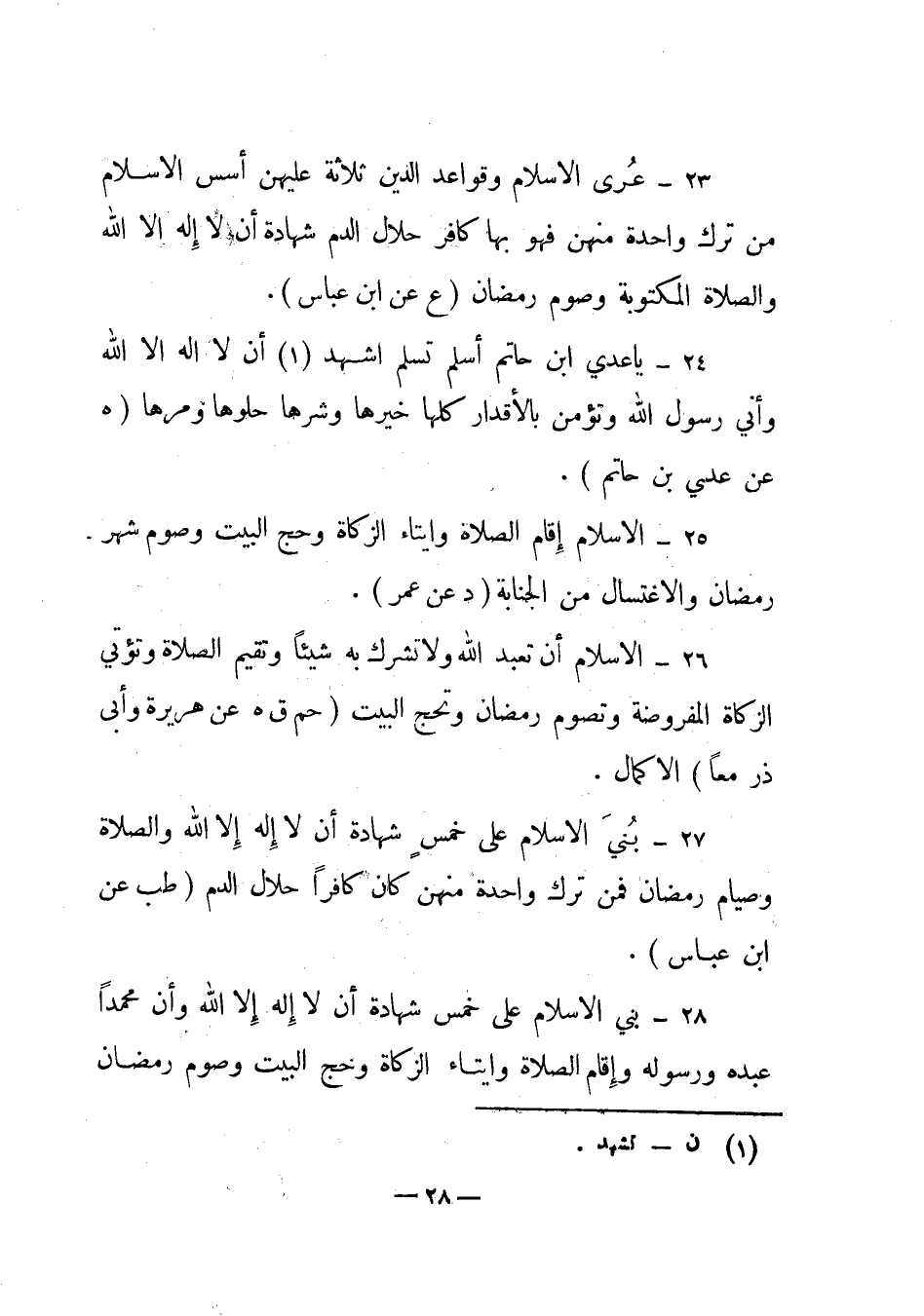 28 – "بني الإسلام على خمس شهادة أن لا إله إلا الله وأن محمدا عبده ورسوله وإقام الصلاة وإيتاء الزكاة وحج البيت وصوم رمضان