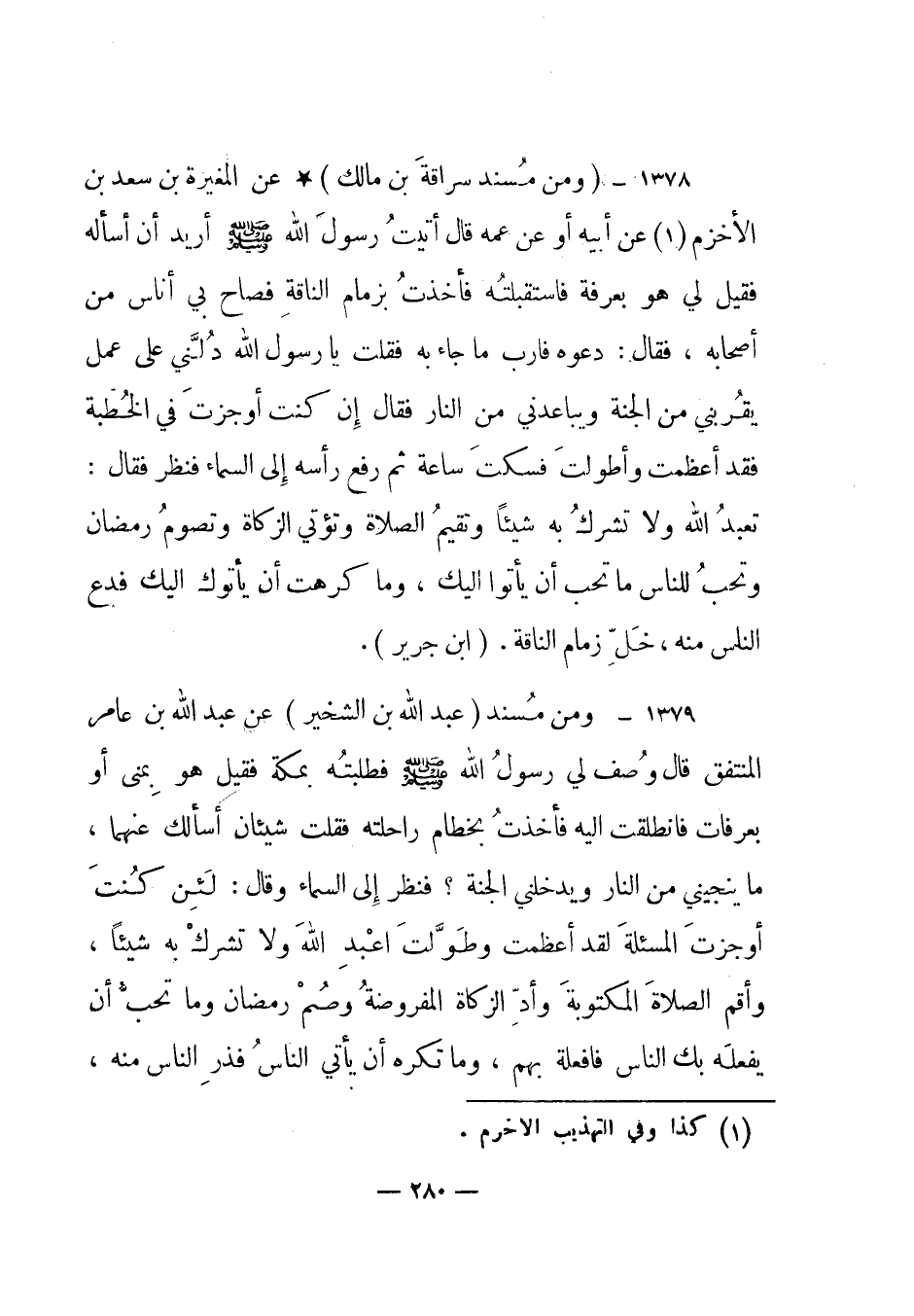 1378 - (ومن مسند سراقة بن مالك) عن المغيرة بن سعد بن الأخزم (1) عن أبيه أو عن عمه قال "أتيت رسول الله صلى الله عليه وسلم أريد أن أسأله فقيل لي هو بعرفة فاستقبلته فأخذت بزمام الناقة فصاح بي أناس من أصحابه فقال: دعوه فارب ماجاء به فقلت يا رسول الله دلني على عمل يقربني من الجنة ويباعدني من النار فقال إن كنت أوجزت في الخطبة فقد أعظمت وأطولت فسكت ساعة ثم رفع رأسه إلى السماء فنظر فقال: تعبد الله ولا تشرك به شيئا وتقيم الصلاة وتؤتي الزكاة وتصوم رمضان وتحب للناس ما تحب أن يأتوا إليك، وما كرهت أن يأتوك إليك فدع الناس منه، خل زمام الناقة". (ابن جرير) .