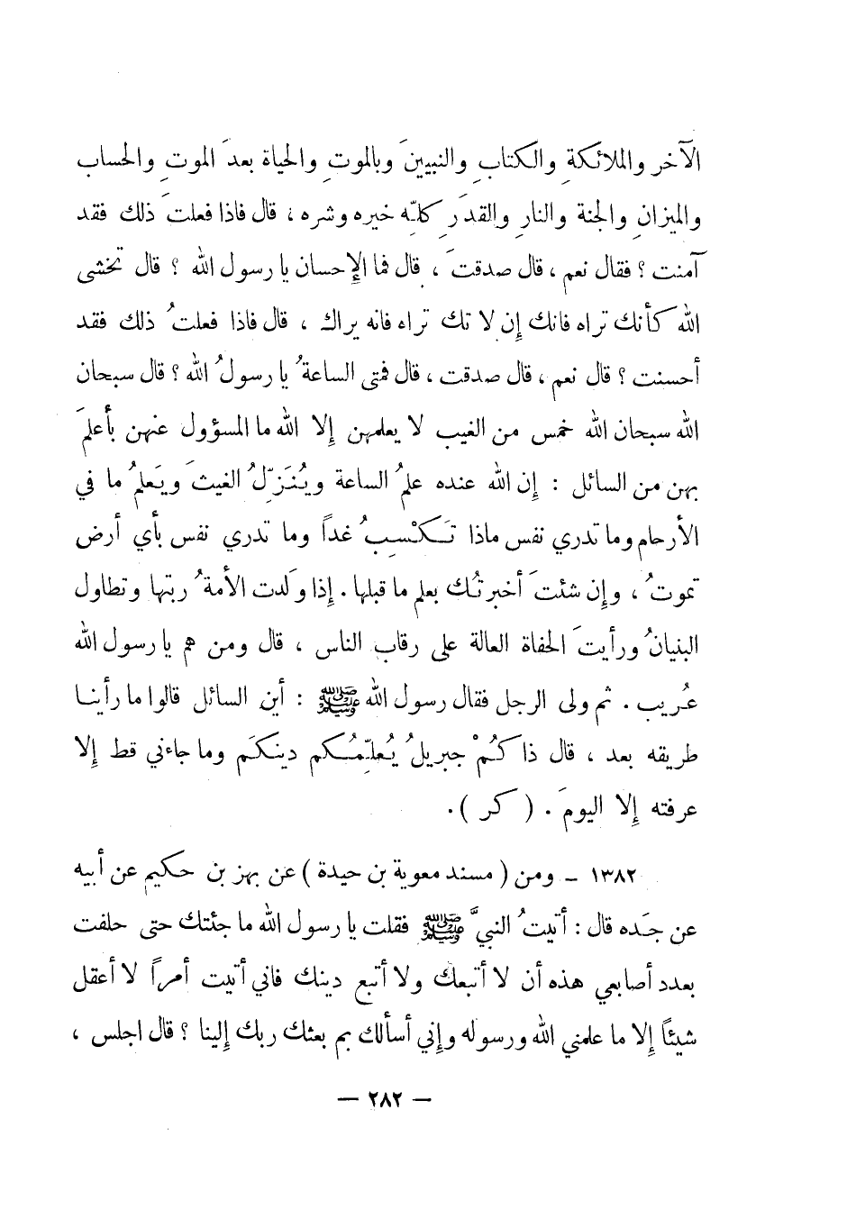 الآخر والملائكة والكتاب والنبيين وبالموت والحياة بعد الموت والحساب والميزان والجنة والنار والقدر كله خيره وشره، قال فإذا فعلت ذلك فقد آمنت؟ فقال نعم، قال صدقت قال فما الإحسان يا رسول الله؟ قال تخشى الله كأنك تراه فإنك إن لا تك تراه فإنه يراك، قال فإذا فعلت ذلك فقد أحسنت؟ قال نعم، قال صدقت، قال فمتى الساعة يا رسول الله؟ قال سبحان الله سبحان الله خمس من الغيب لا يعلمهن إلا الله ما المسؤول عنهن بأعلم بهن من السائل: إن الله عنده علم الساعة وينزل الغيث ويعلم ما في الأرحام وما تدري نفس ماذا تكسب غدا وما تدري نفس بأي أرض تموت، وإن شئت أخبرتك بعلم ما قبلها. إذا ولدت الأمة ربتها وتطاول البنيان ورأيت الحفاة العالة على رقاب الناس، قال ومن هم يا رسول الله عريب. ثم ولى الرجل فقال رسول الله صلى الله عليه وسلم: أين السائل قالوا ما رأينا طريقه بعد، قال ذاكم جبريل يعلمكم دينكم وما جاءني قط إلا عرفته إلا اليوم". (كر) .