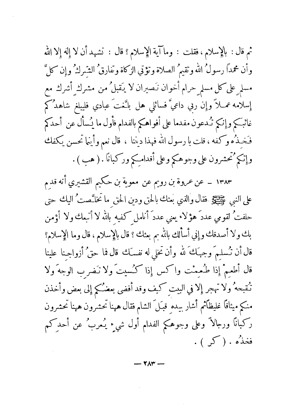 1383 - عن عروة بن رويم عن معوية بن حكيم القشيري أنه قدم على النبي صلى الله عليه وسلم فقال: " والذي بعثك بالحق ودين الحق ما تخلصت إليك حتى حلفت لقومي عدد هؤلاء يعني يعني عدد أنامل كفيه بالله لا أتبعك ولا أؤمن بك ولا أصدقك وإني أسألك بالله بما بعثك؟ قال بالإسلام، قال وما الإسلام؟ قال أن تسلم وجهك لله وأن تخلي له نفسك قال فما حق أزواجنا علينا قال أطعم إذا طعمت واكس إذا كسيت ولا تضرب الوجه ولا تقبحه ولا تهجر إلا في البيت كيف وقد أفضى بعضكم إلى بعض وأخذن منكم ميثاقا غليظا ثم أشار بيده قبل الشام فقال ههنا تحشرون ههنا تحشرون ركبانا ورجالا وعلى وجوهكم الفدام أول شيء يعرب عن أحدكم فخذه". (كر) .