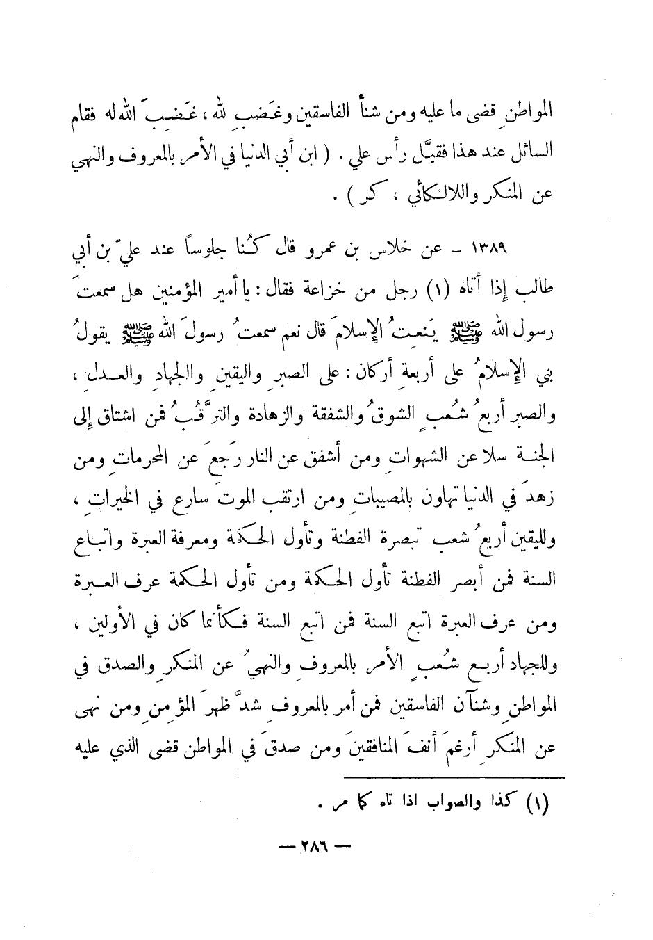 1389 - عن خلاس بن عمرو قال كنا جلوسا عند علي بن أبي طالب إذا أتاه (1) رجل من خزاعة فقال: "يا أمير المؤمنين هل سمعت رسول الله صلى الله عليه وسلم ينعت الإسلام قال نعم سمعت رسول الله صلى الله عليه وسلم يقول: "بني الإسلام على أربعة أركان: على الصبر واليقين والجهاد والعدل، والصبر أربع شعب الشوق والشفقة والزهادة والترقب فمن اشتاق إلى الجنة سلا عن الشهوات ومن أشفق عن النار رجع عن المحرمات ومن زهد في الدنيا تهاون بالمصيبات ومن ارتقب الموت سارع في الخيرات، ولليقين أربع شعب تبصرة الفطنة وتأول الحكمة ومعرفة العبرة واتباع السنة فمن أبصر الفطنة تأول الحكمة ومن تأول الحكمة عرف العبرة ومن عرف العبرة اتبع السنة فمن اتبع السنة فكأنما كان في الأولين، وللجهاد أربع شعب الأمر بالمعروف والنهي عن المنكر والصدق في المواطن وشنآن الفاسقين فمن أمر بالمعروف شد ظهر المؤمن ومن نهى عن المنكر أرغم أنف المنافقين ومن صدق في المواطن قضى الذي عليه