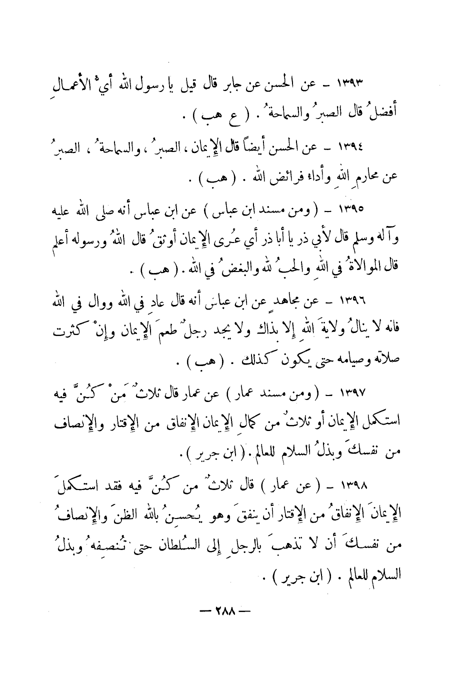 1396 - عن مجاهد عن ابن عباس أنه قال "عاد في الله ووال في الله فإنه لا ينال ولاية الله إلا بذاك ولا يجد رجل طعم الإيمان وإن كثرت صلاته وصيامه حتى يكون كذلك". (هب) .