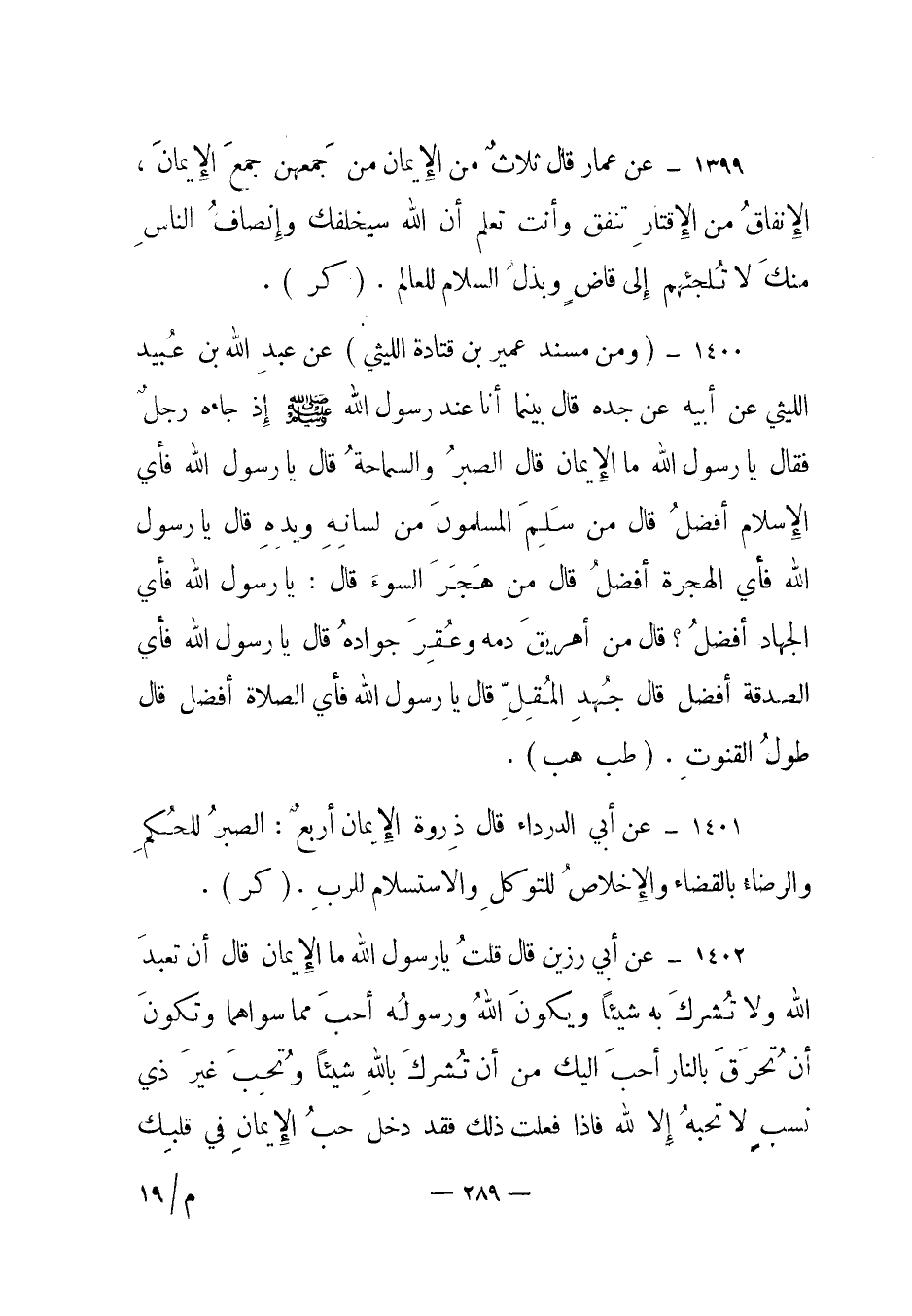 1400 - (ومن مسند عمير بن قتادة الليثي) عن عبد الله بن عبيد الليثي عن ابيه عن جده قال "بينما أنا عند رسول الله صلى الله عليه وسلم إذ جاءه رجل فقال: يا رسول الله ما الإيمان قال الصبر والسماحة قال يا رسول الله فأي الإسلام أفضل قال من سلم المسلمون من لسانه ويده قال يا رسول الله فأي الهجرة أفضل قال من هجر السوء قال: يا رسول الله فأي الجهاد أفضل؟ قال: من أهريق دمه وعقر جواده قال يا رسول الله فأي الصدقة أفضل قال جهد المقل قال يا رسول الله فأي الصلاة أفضل قال طول القنوت". (طب هب) .