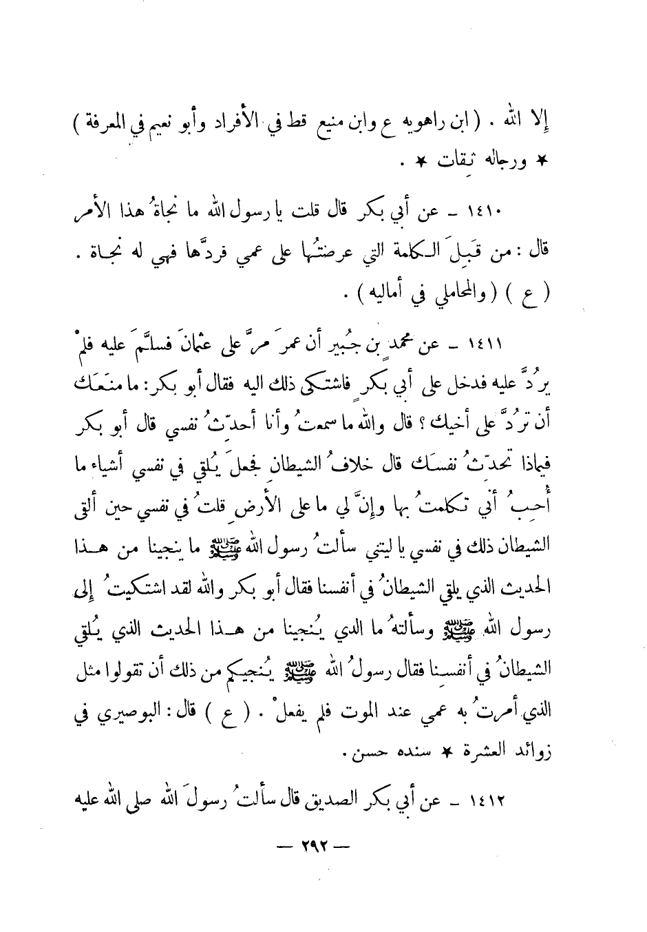 1410 - عن أبي بكر قال قلت يا رسول الله ما نجاة هذا الأمر قال: "من قبل الكلمة التي عرضتها على عمي فردها فهي له نجاة" (ع) (والمحاملي في أماليه) .