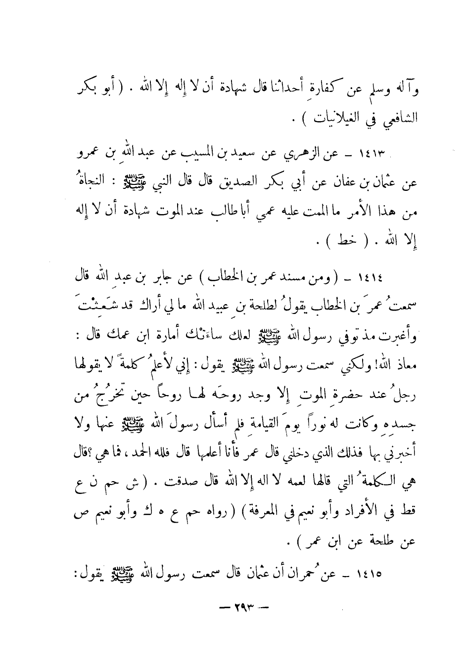 1413 - عن الزهري عن سعيد بن المسيب عن عبد الله بن عمرو عن عثمان بن عفان عن أبي بكر الصديق قال قال النبي صلى الله عليه وسلم: "النجاة من هذا الأمر ما الممت عليه عمي أبا طالب عند الموت شهادة أن لا إله إلا الله". (خط) .