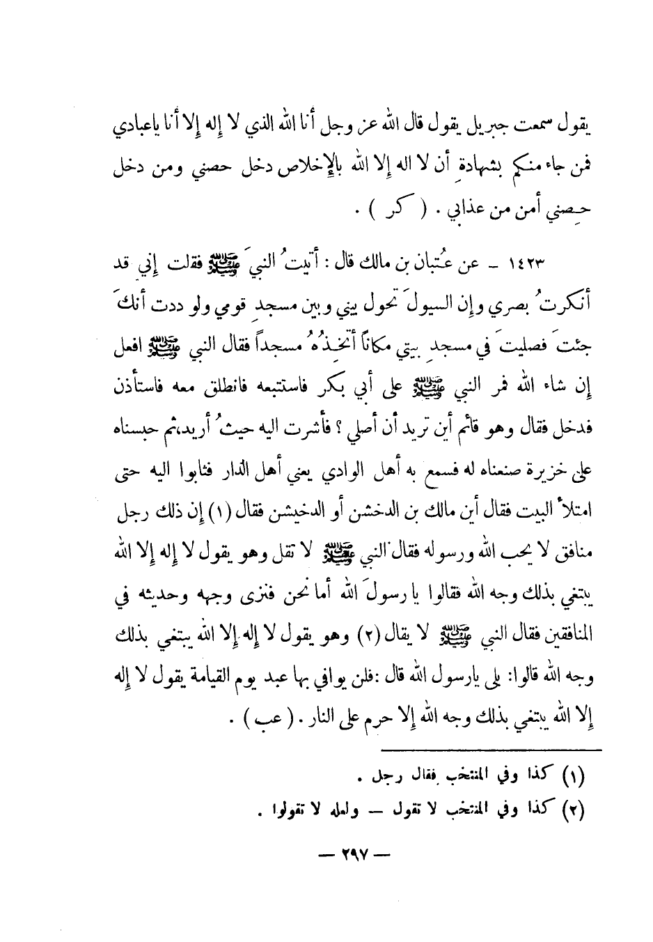 1423 - عن عتبان بن مالك قال: " أتيت النبي صلى الله عليه وسلم فقلت إني قد أنكرت بصري وإن السيول تحول بيني وبين مسجد قومي ولوددت أنك جئت فصليت في مسجد بيتي مكانا أتخذه مسجدا فقال النبي صلى الله عليه وسلم افعل إن شاء الله فمر النبي صلى الله عليه وسلم على أبي بكر فاستتبعه فانطلق معه فاستأذن فدخل فقال وهو قائم أين تريد أن أصلي؟ فأشرت إليه حيث أريد، ثم حبسناه على خزيرة صنعناه له فسمع به أهل الوادي يعني أهل الدار فثابوا إليه حتى امتلأ البيت فقال أين مالك بن الدخشن أوالدخيشن فقال (1) إن ذلك رجل منافق لا يحب الله ورسوله فقال النبي صلى الله عليه وسلم لا تقل وهو يقول لا إله إلا الله يبتغي بذلك وجه الله فقالوا يا رسول الله أما نحن فنرى وجهه وحديثه في المنافقين فقال النبي صلى الله عليه وسلم لا يقال (2) وهويقول لا إله إلا الله يبتغي بذلك وجه الله قالوا: بلى يا رسول الله قال: فلن يوافي بها عبد يوم القيامة يقول لا إله إلا الله يبتغي بذلك وجه الله إلا حرم على النار". (عب) .