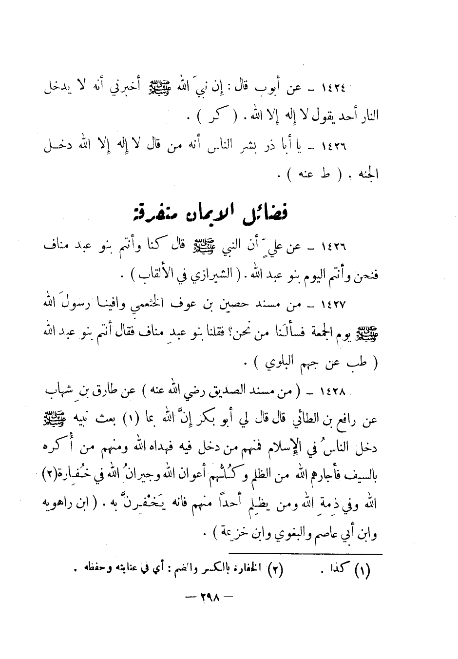 1426 - عن علي أن النبي صلى الله عليه وسلم قال "كنا وأنتم بنو عبد مناف فنحن وأنتم اليوم بنو عبد الله ". (الشيرازي في الألقاب) .