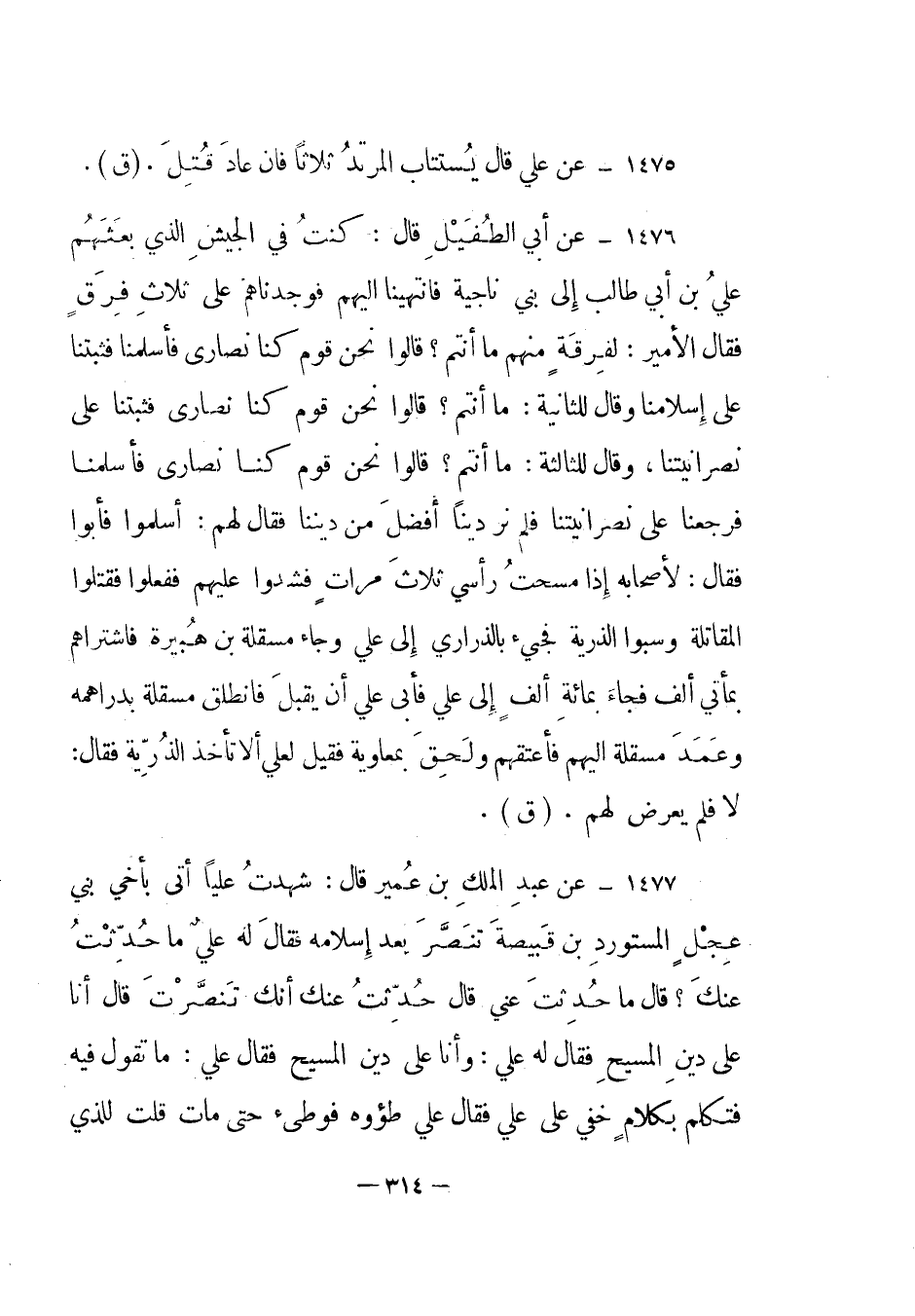 1477 - عن عبد الملك بن عمير قال: "شهدت علي أتى بأخي بني عجل المستورد بن قبيصة تنصر بعد إسلامه فقال له علي ما حدثت عنك؟ قال ما حدثت عني قال حدثت عنك أنك تنصرت قال أنا على دين المسيح فقال له علي: وأنا على دين المسيح فقال علي: ما تقول فيه فتكلم بكلام خفي على علي فقال علي طؤوه فوطئ حتى مات قلت للذي
