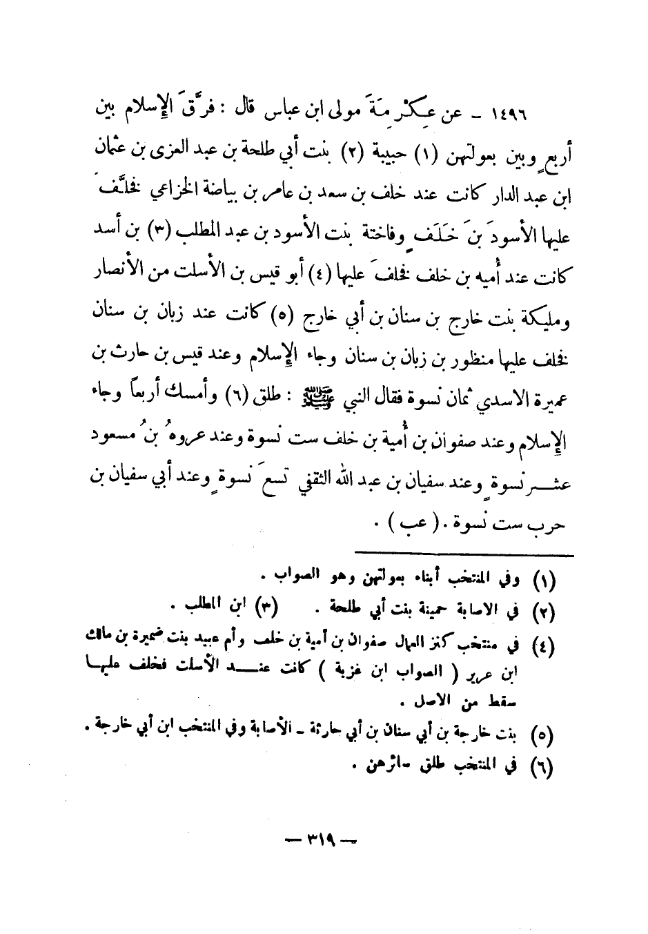 1496 - عن عكرمة مولى ابن عباس قال: "فرق الإسلام بين أربع وبين بعولتهن (1) حبيبة (2) بنت أبي طلحة بن عبد العزى بن عثمان ابن عبد الدار كانت عند خلف بن سعد بن عامر بن بياضة الخزاعي فخلف عليها الأسود بن خلف وفاخته بنت الأسود بن عبد المطلب (3) بن أسد كانت عند أمية بن خلف فخلف عليها (4) أبو قيس بن الأسلت من الأنصار ومليكة بنت خارج بنت سنان بن أبي خارج (5) كانت عند زبان بن سنان فخلف عليها منظور بن زبان بن سنان وجاء الإسلام وعند قيس بن حارث بن عميرة الأسدي ثمان نسوة فقال النبي صلى الله عليه وسلم: " طلق (6) وأمسك أربعا" وجاء الإسلام وعند صفوان بن أمية بن خلف ست نسوة وعند عروة بن مسعود عشر نسوة وعند سفيان بن عبد الله الثقفي تسع نسوة وعند أبي سفيان بن حرب ست نسوة. (عب) .