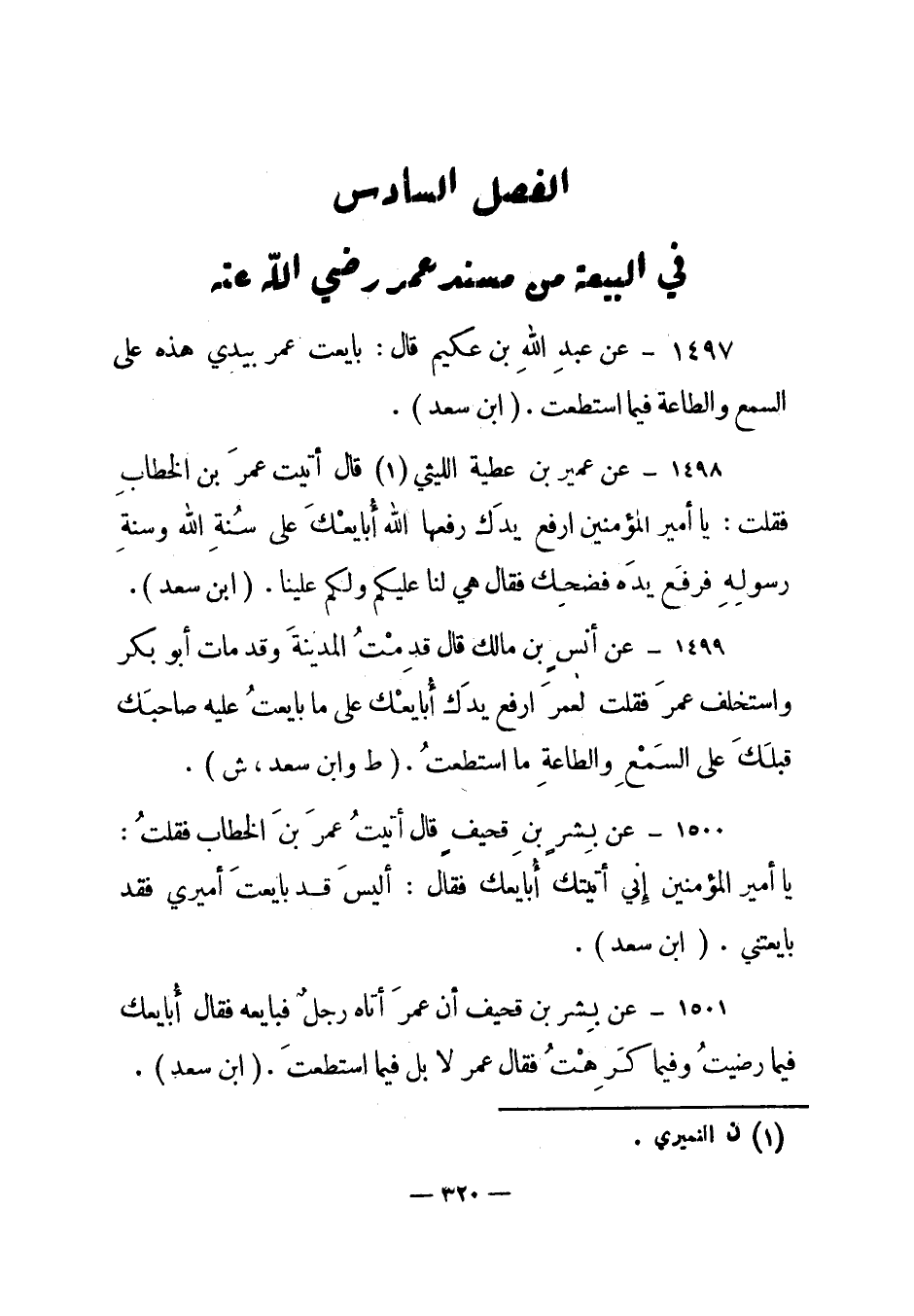 1497 - عن عبد الله بن عكيم قال: "بايعت عمر بيدي هذه على السمع والطاعة فيما استطعت". (ابن سعد) .