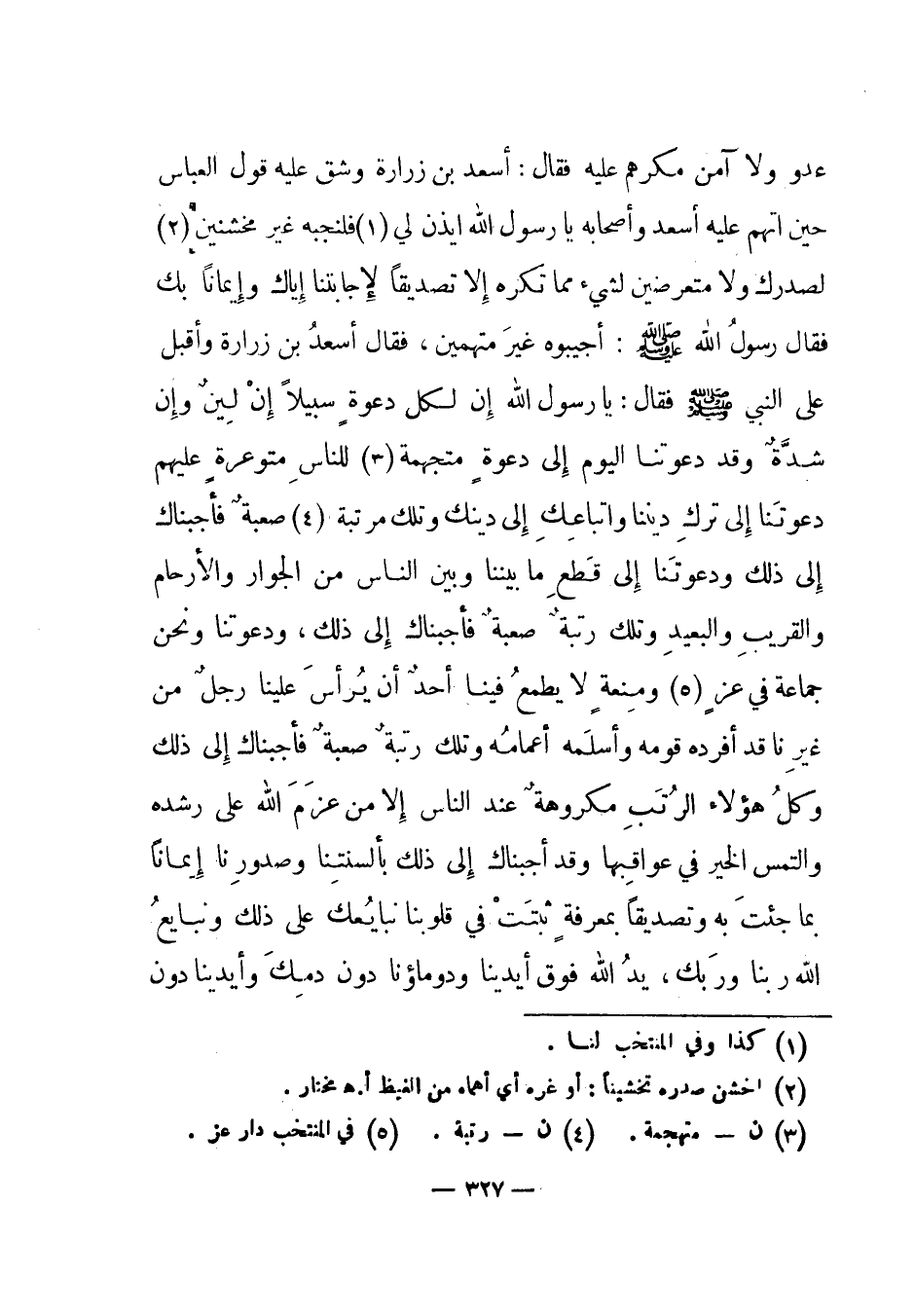 عدو ولا آمن مكرهم عليه فقال: أسعد بن زرارة وشق عليه قول العباس حين اتهم عليه أسعد وأصحابه يا رسول الله ايذن لي (1) فلنجبه غير مخشنين (2) لصدرك ولا متعرضين لشيء مما تكره إلا تصديقا لإجابتنا إياك وإيمانا بك فقال رسول الله صلى الله عليه وسلم: "أجيبوه غير متهمين"، فقال أسعد بن زرارة وأقبل على النبي صلى الله عليه وسلم فقال: يا رسول الله إن لكل دعوة سبيلا إن لين وإن شدة وقد دعوتنا اليوم إلى دعوة متجهمة (3) للناس متوعرة عليهم دعوتنا إلى ترك ديننا واتباعك إلى دينك وتلك مرتبة (4) صعبة فأجبناك إلى ذلك ودعوتنا إلى قطع ما بيننا وبين الناس من الجوار والأرحام والقريب والبعيد وتلك رتبة صعبة فأجبناك إلى ذلك، ودعوتنا ونحن جماعة في عز (5) ومنعة لا يطمع فينا أحد أن يرأس علينا رجل من غيرنا قد أفرده قومه وأسلمه أعمامه وتلك رتبة صعبة فأجبناك إلى ذلك وكل هؤلاء الرتب مكروهة عند الناس إلا من عزم الله على رشده والتمس الخير في عواقبها وقد أجبناك إلى ذلك بألسنتنا وصدورنا إيمانا بما جئت به وتصديقا بمعرفة ثبتت في قلوبنا نبايعك على ذلك ونبايع الله ربنا وربك، يد الله فوق أيدينا ودماؤنا دون دمك وأيدينا دون