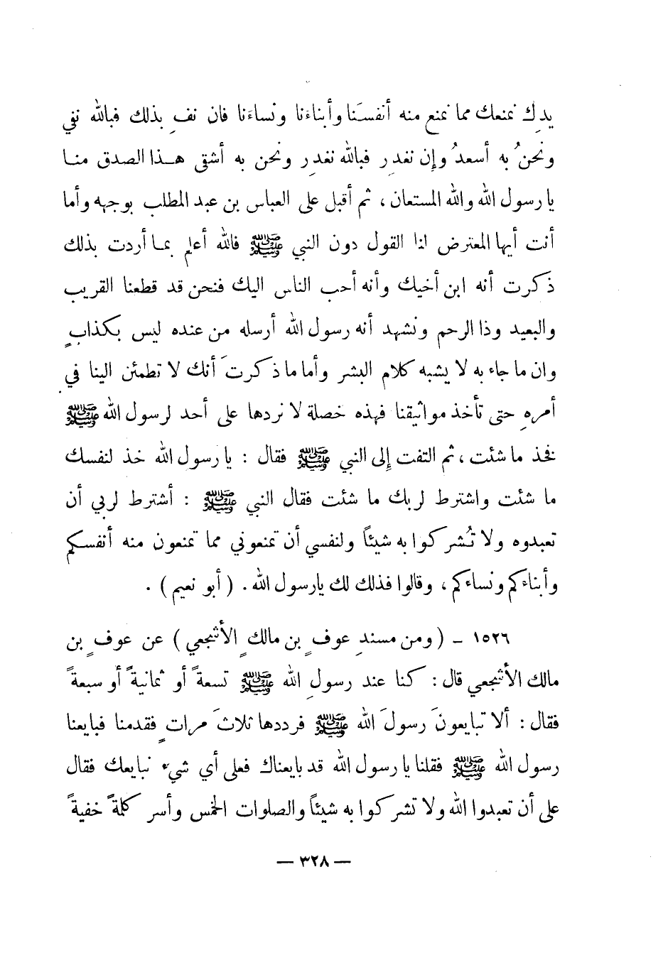 1526 - (ومن مسند عوف بن مالك الأشجعي) عن عوف بن مالك الأشجعي قال: كنا عند رسول الله صلى الله عليه وسلم تسعة أو ثمانية أو سبعة فقال: "ألا تبايعون رسول الله صلى الله عليه وسلم فرددها ثلاث مرات فقدمنا فبايعنا رسول الله صلى الله عليه وسلم فقلنا يا رسول الله قد بايعناك فعلى أي شيء نبايعك فقال على أن تعبدوا الله ولا تشركوا به شيئا والصلوات الخمس وأسر كلمة خفية