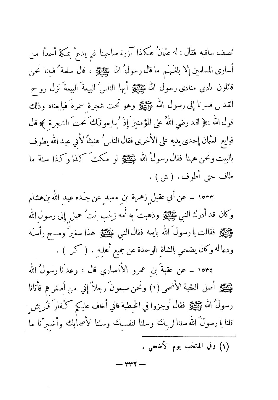 نصف ساقيه فقال: له عثمان هكذا آزرة صاحبنا فلم يدع بمكة أحدا من أسارى المسلمين إلا بلغهم ما قال رسول الله صلى الله عليه وسلم، قال سلمة فبينا نحن قائلون نادى منادي رسول الله صلى الله عليه وسلم: أيها الناس البيعة البيعة نزل روح القدس فسرنا إلى رسول الله صلى الله عليه وسلم وهو تحت شجرة سمرة فبايعناه وذلك قول الله: {لَقَدْ رَضِيَ اللَّهُ عَنِ الْمُؤْمِنِينَ إِذْ يُبَايِعُونَكَ تَحْتَ الشَّجَرَةِ} قال فبايع لعثمان إحدى يديه على الأخرى فقال الناس هنيئا لأبي عبد الله يطوف بالبيت ونحن ههنا فقال رسول الله صلى الله عليه وسلم لو مكث كذا وكذا سنة ما طاف حتى أطوف". (ش) .