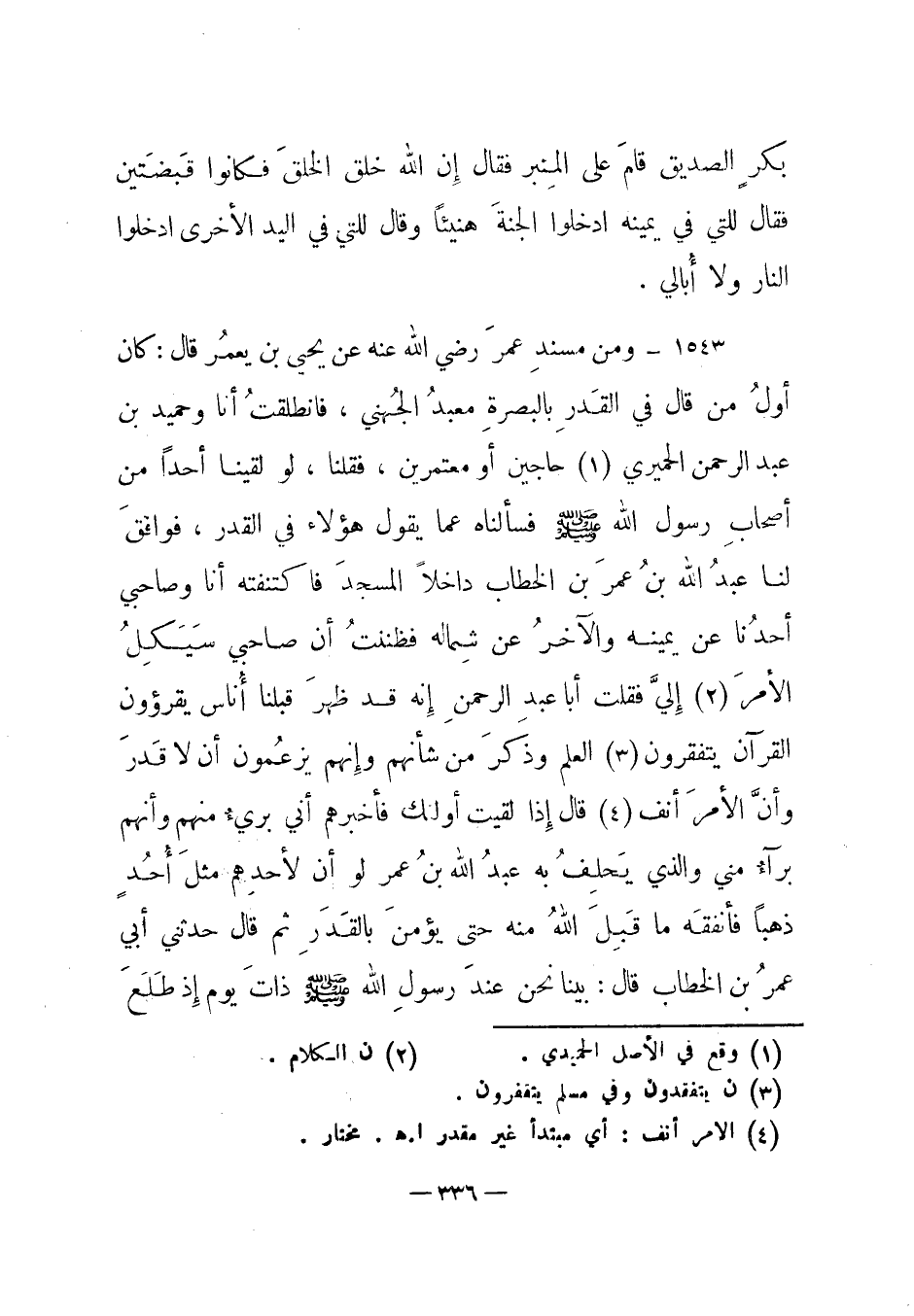 1543 - ومن مسند عمر رضي الله عنه عن يحيى بن يعمر قال: "كان أول من قال في القدر بالبصرة معبد الجهني، فانطلقت أنا وحميد بن عبد الرحمن الحميري (1) حاجين أو معتمرين، فقلنا، لو لقينا أحدا من أصحاب رسول الله صلى الله عليه وسلم فسألناه عما يقول هؤلاء في القدر، فوافق لنا عبد الله بن عمر بن الخطاب داخلا المسجد فاكتنفته أنا وصاحبي أحدنا عن يمينه والآخر عن شماله فظننت أن صاحبي سيكل الأمر (2) إلي فقلت أبا عبد الرحمن إنه قد ظهر قبلنا أناس يقرؤون القرآن يتفقرون (3) العلم وذكر من شأنهم وإنهم يزعمون أن لا قدر وأن الأمر أنف (4) قال إذا لقيت أولئك فأخبرهم أني بريء منهم وأنهم برآء مني والذي يحلف به عبد الله بن عمر لو أن لأحدهم مثل أحد ذهبا فأنفقه ما قبل الله منه حتى يؤمن بالقدر ثم قال حدثني أبي عمر بن الخطاب قال: بينا نحن عند رسول الله صلى الله عليه وسلم ذات يوم إذ طلع