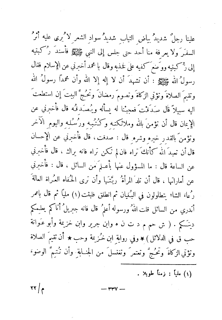 علينا رجل شديد بياض الثياب شديد سواد الشعر لا يرى عليه أثر السفر ولا يعرفه منا أحد حتى جلس إلى النبي صلى الله عليه وسلم فأسند ركبتيه إلى ركبتيه ووضع كفيه على فخذيه وقال: يا محمد أخبرني عن الإسلام فقال رسول الله صلى الله عليه وسلم: أن تشهد أن لا إله إلا الله وأن محمدا رسول الله وتقيم الصلاة وتؤتي الزكاة وتصوم رمضان وتحج البيت إن استطعت إليه سبيلا قال صدقت فعجبنا له يسأله ويصدقه قال فأخبرني عن الإيمان قال أن تؤمن بالله وملائكته وكتبه ورسله واليوم الآخر وتؤمن بالقدر خيره وشره قال: صدقت، قال فأخبرني عن الإحسان قال أن تعبد الله كأنك تراه فإن لم تكن تراه فإنه يراك، قال فأخبرني عن الساعة قال: ما المسؤول عنها بأعلم من السائل، قال: فأخبرني عن أماراتها، قال أن تلد المرأة ربتها وأن ترى الحفاه العراة العالة رعاء الشاء يتطاولون في البنيان ثم انطلق فلبثت (1) مليا ثم قال يا عمر أتدري من السائل قلت الله ورسوله أعلم قال فإنه جبريل أتاكم يعلمكم دينكم". (ش حم م د ت ن هـ وابن جرير وابن خزيمة وأبو عوانة حب ق في الدلائل) وفي رواية ابن خزيمة وحب "أن تقيم الصلاة وتؤتي الزكاة وتحج وتعتمر وتغتسل من الجنابة وأن تتم الوضوء