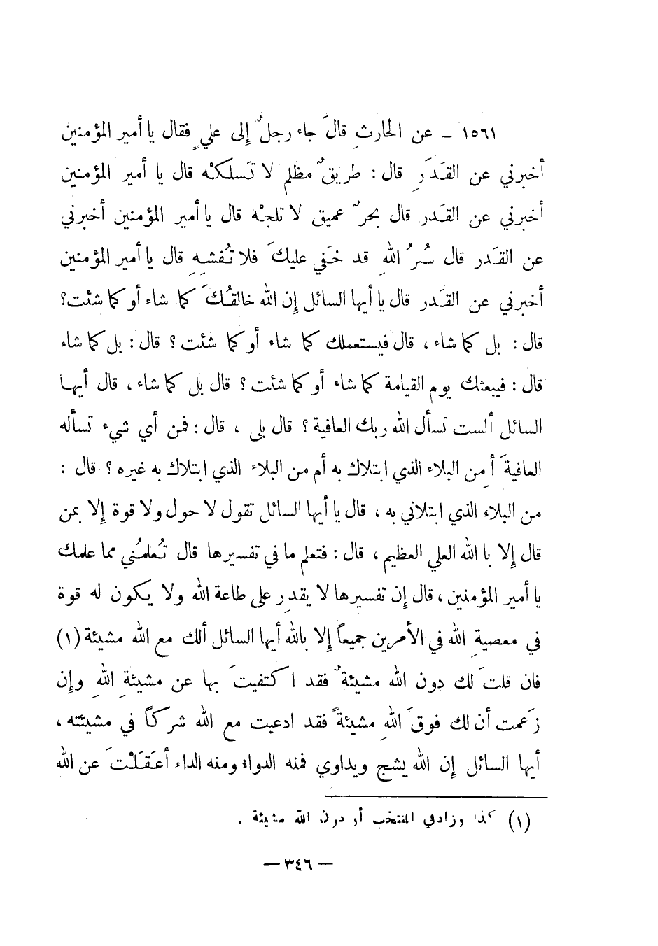 1561 - عن الحارث قال جاء رجل إلى علي فقال: "يا أمير المؤمنين أخبرني عن القدر. قال: طريق مظلم، لا تسلكه. قال: يا أمير المؤمنين أخبرني عن القدر. قال بحر عميق، لا تلجه. قال: يا أمير المؤمنين أخبرني عن القدر. قال: سر الله قد خفي عليك، فلا تفشه. قال: يا امير المؤمنين أخبرني عن القدر. قال: يا أيها السائل، إن الله خالقك كما شاء أو كما شئت؟ قال: بل كما شاء. قال: فيستعملك كما شاء أو كما شئت؟ قال: بل كما شاء. قال: فيبعثك يوم القيامة كما شاء أو كما شئت؟ قال: بل كما شاء. قال: أيها السائل ألست تسأل الله ربك العافية؟ قال بلى. قال: فمن أي شيء تسأله العافية؛ أمن البلاء الذي ابتلاك به، أم من البلاء الذي ابتلاك به غيره؟ قال: من البلاء الذي ابتلاني به. قال: يا أيها السائل، تقول لا حول ولا قوة إلا بمن؟ قال: إلا بالله العلي العظيم. قال: فتعلم ما في تفسيرها؟ قال: تعلمني مما علمك يا أمير المؤمنين. قال: إن تفسيرها: لا يقدر على طاعة الله، ولا يكون له قوة في معصية الله، في الأمرين جميعا، إلا بالله. أيها السائل ألك مع الله مشيئة (1) فإن قلت لك دون الله مشيئة، فقد اكتفيت بها عن مشيئة الله، وإن زعمت أن لك فوق الله مشيئة، فقد ادعيت مع الله شركا في مشيئته. أيها السائل، إن الله يشج ويداوي؛ فمنه الدواء ومنه الداء. أعقلت عن الله