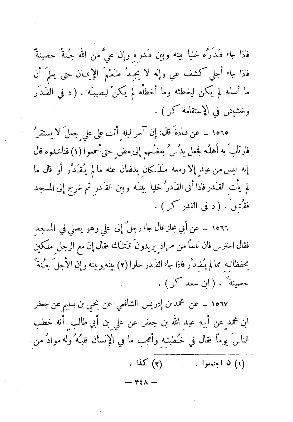 1566 - عن أبي مجلز قال "جاء رجل إلى علي وهو يصلي في المسجد فقال احترس فإن ناسا من مراد يريدون قتلك فقال إن مع الرجل ملكين يحفظانه مما لم يقدر فإذا جاء القدر خلوا (2) بينه وبينه وإن الأجل جنة حصينة". (ابن سعد كر) .